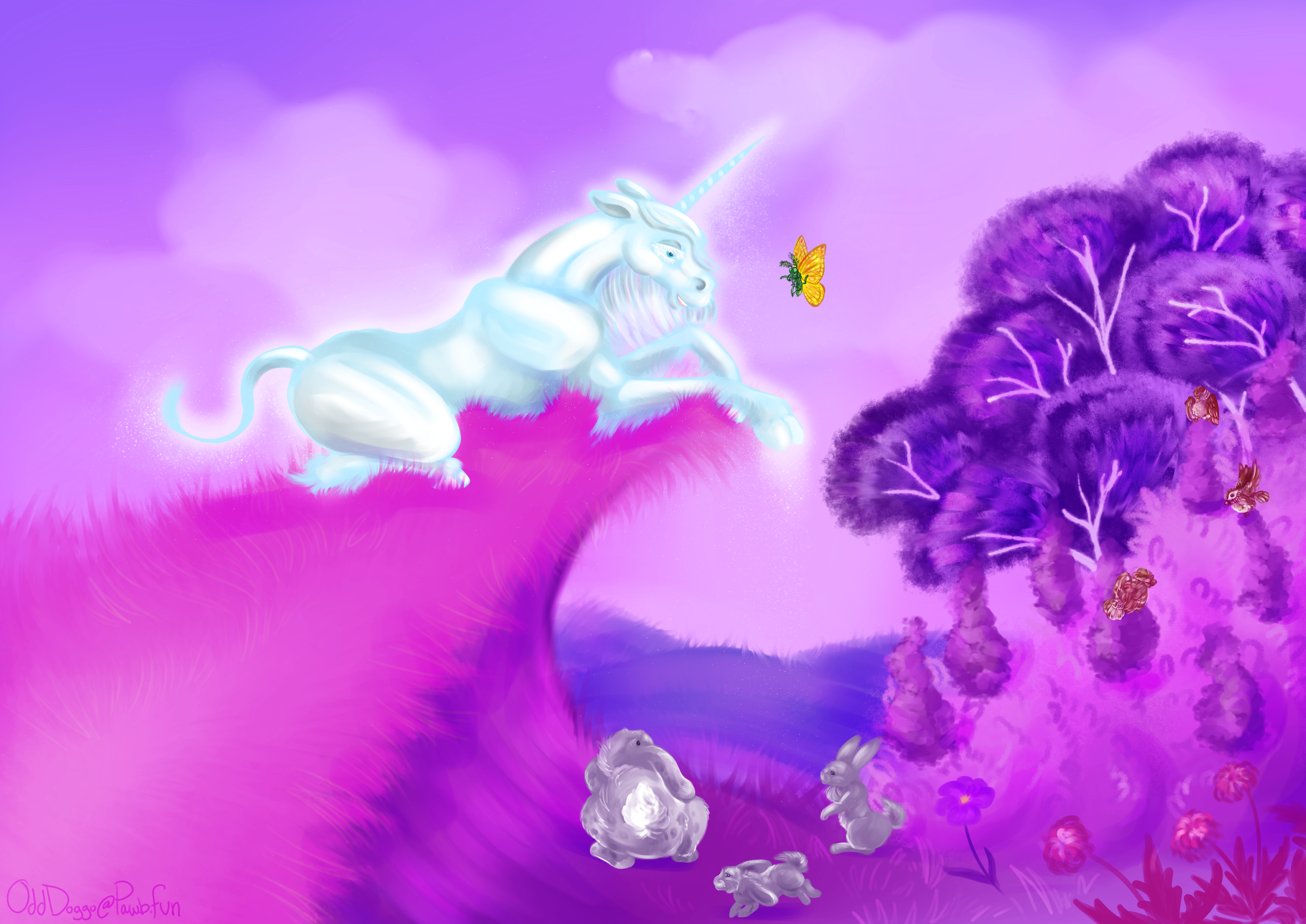 Image description: A unicorn sits ona hill, speaking to a yellow butterfly that hangs before her in the air. Rabbits and birds play nearby in the grass and bushes.' “Butterfly, what are you doing out on such a windy day?” she asked him. “You’ll take cold and die long before your time.” “Death takes what man would keep,” said the butterfly “and leaves what man would lose. Blow, wind, and crack your cheeks. I warm my hands before the fire of life and get four-way relief.” He glimmered like a scrap of owl-light on her horn.' Image description: A unicorn sits ona hill, speaking to a yellow butterfly that hangs before her in the air. Rabbits and birds play nearby in the grass and bushes.0 Comments 0 Shares 26 Views -