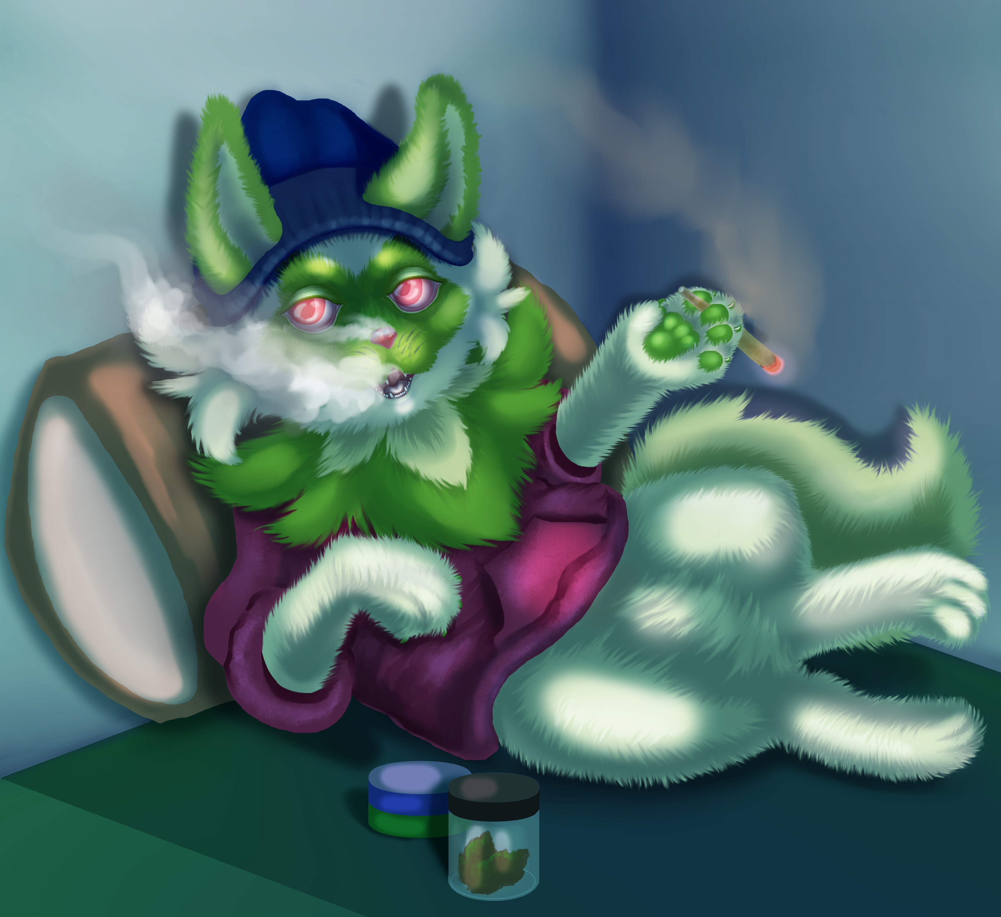 Image Description: The pokemon sprigatito, laying ona bed, smoking something while wearing a purple hoodie and blue hatThis kind of art happens very infrequently, its mostly furry stuff and monsters. Image Description: The pokemon sprigatito, laying ona bed, smoking something while wearing a purple hoodie and blue hat0 Comments 0 Shares 27 Views -