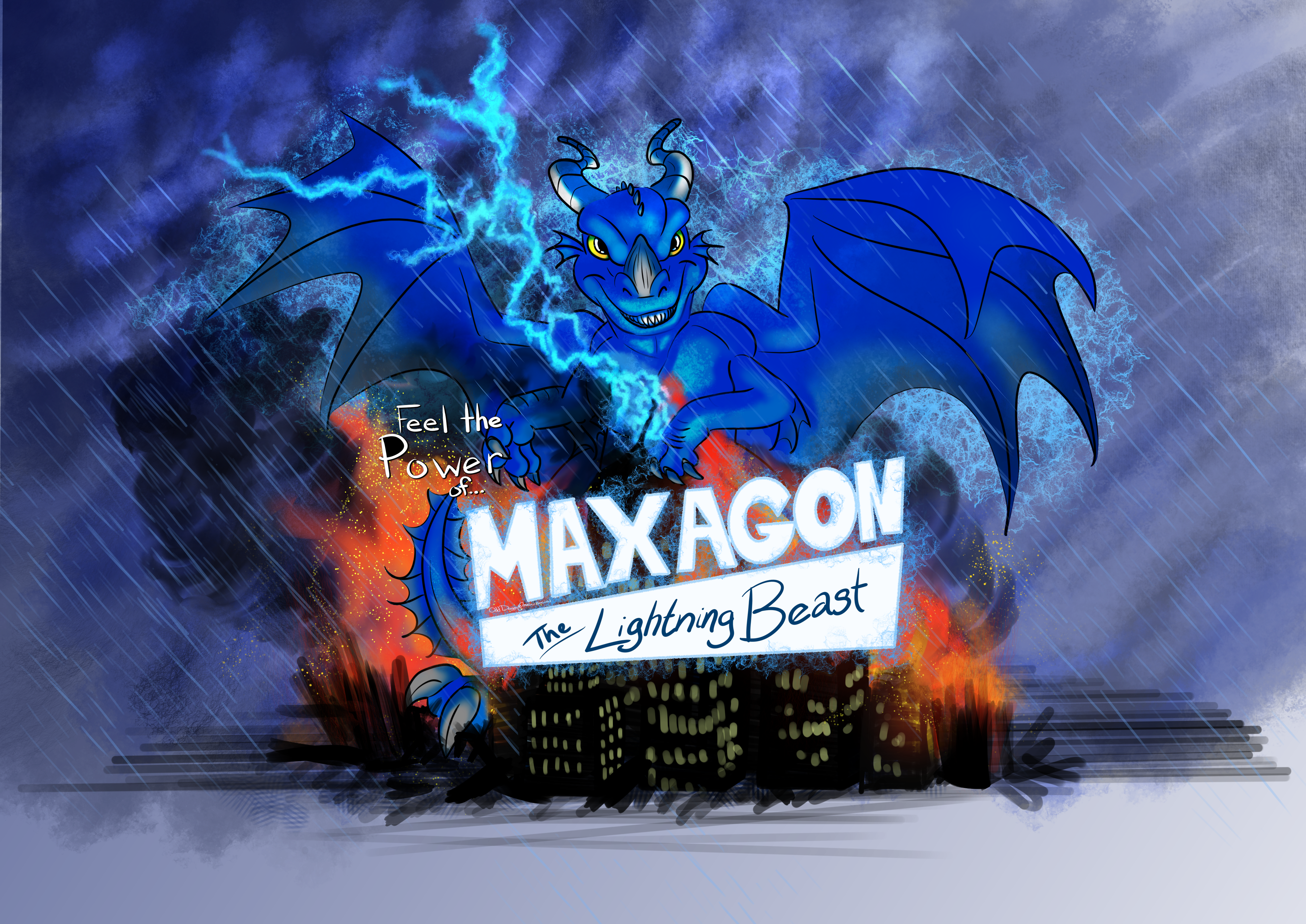 Image Desciption: Digital drawing of a big blue reptilian monster, stomping around a city. Thier large wings ar outstreched and a bolt of lightning bisects the image, above the words 'Maxagon The Lightning Beast'Image Desciption: Digital drawing of a big blue reptilian monster, stomping around a city. Thier large wings ar outstreched and a bolt of lightning bisects the image, above the words 'Maxagon The Lightning Beast'0 Comments 0 Shares 27 Views