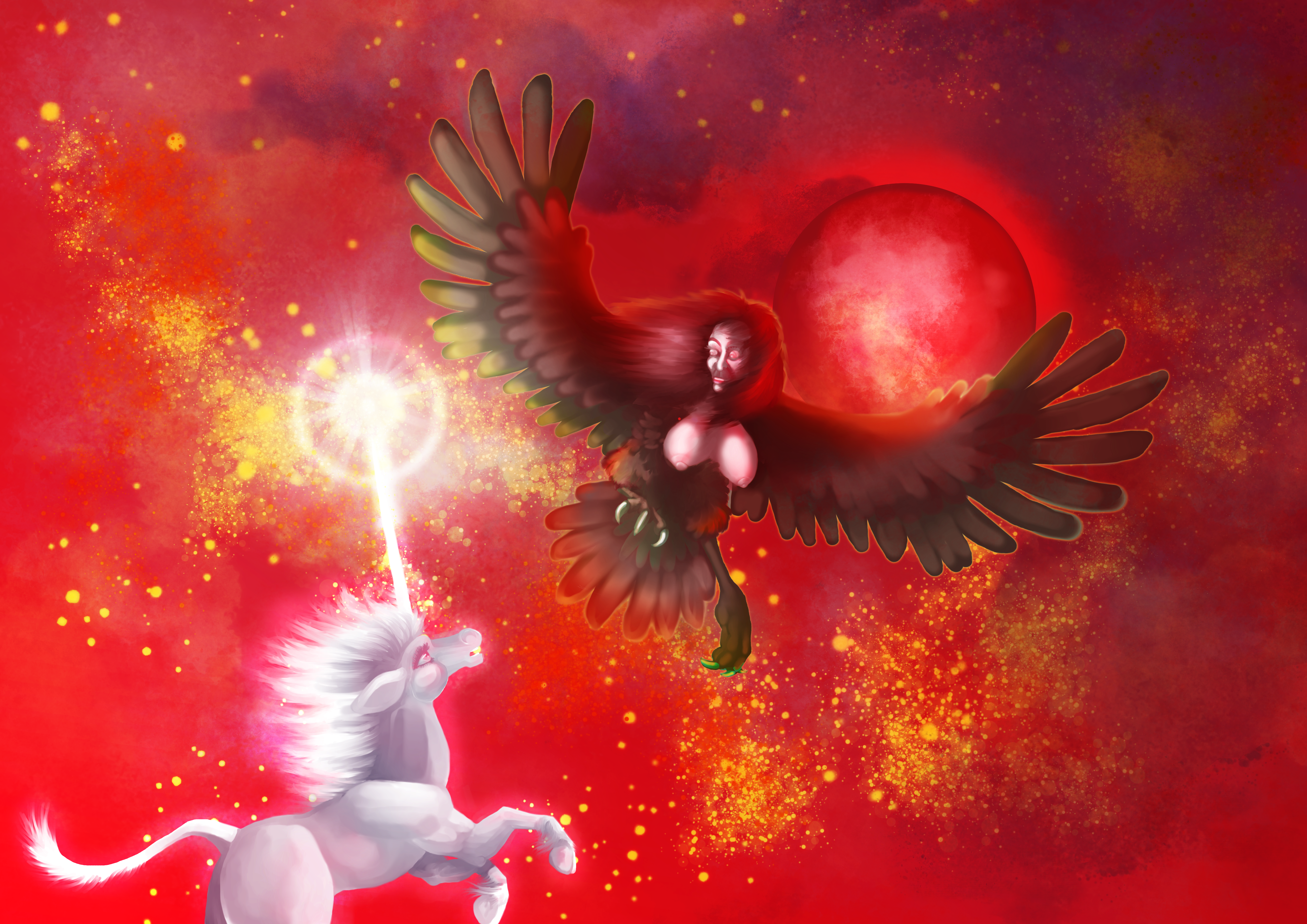 going to strike again.''The unicorn heard herself cry out, not in terror but in wonder, “Oh, you are like me!” She reared joyously to meet the harpy’s stoop, and her horn leaped up into the wicked wind. The harpy struck once, missed, and swung away, her wings clanging and her breath warm and stinking. She burned overhead, and the unicorn saw herself reflected on the harpy’s bronze breast and felt the monster shining from her own body. So they circled one another like a double star, and under the shrunken sky there was nothing real but the two of them. The harpy laughed with delight, and her eyes turned the color of honey. The unicorn knew that she was going to strike again.'0 Comments 0 Shares 25 Views -