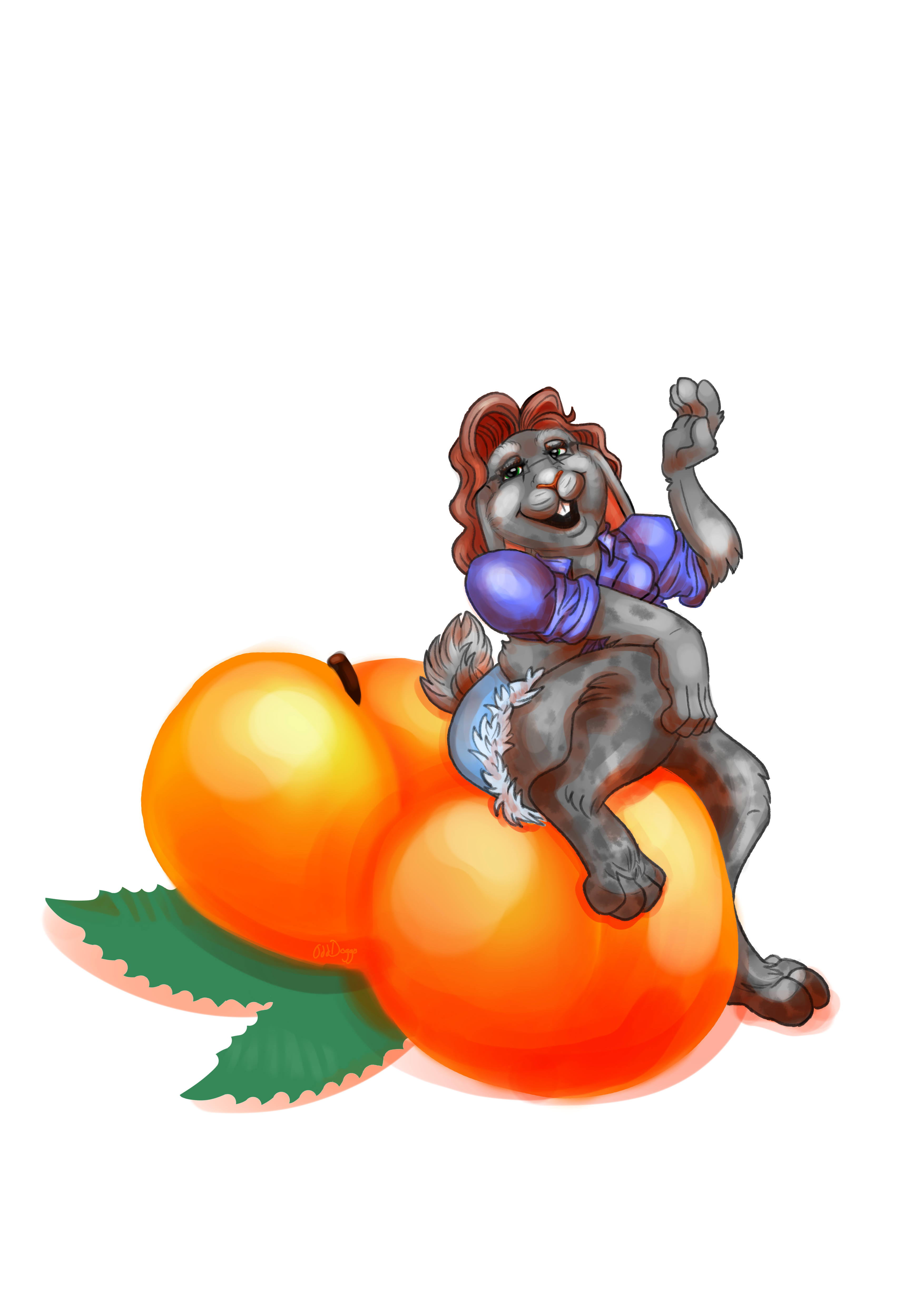 Desc: On a white background a grey, anthropomorphic rabbit with red hair sits on two oversized peaches. I hope you like, gift art0 Comments 0 Shares 26 Views -