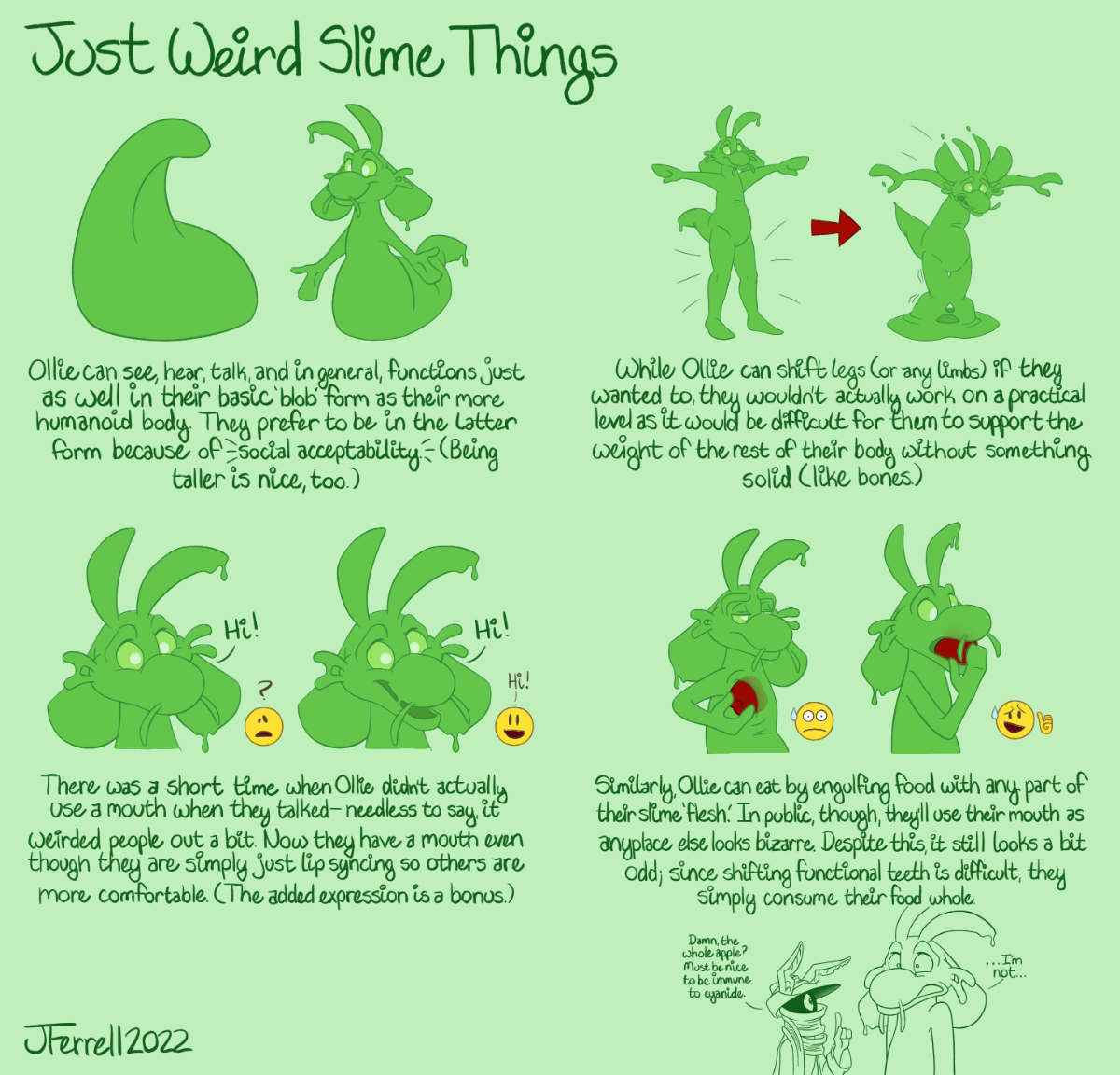 (Don't worry, they're fine, they probably did make Ky help them yank the apple back out, much to her chagrin.)Just a sheet depicting some of their weirder quirks. I honestly have a lot of info about this stuff rattling around in my head and usually I just never get to actually put it out there. Most of it is related to what they do to be presentable to other creatures despite being a weird slime monster because something something clumsy masking metaphor. The little bit at the end with Ky talking about cyanide is actually the result of me thinking of the bottom right diagram, realizing I didn't know how cyanide poisoning worked, and having to look it up only to find, yeah, it actually effects organisms on a cellular level, disrupting their ability to use oxygen. Considering Ollie is nothing if not loose conglomeration of highly adaptable, multi-purpose cells controlled by an intelligence distributed all throughout that mass, they are indeed, probably not immune to cyanide. (Don't worry, they're fine, they probably did make Ky help them yank the apple back out, much to her chagrin.)0 Comments 0 Shares 61 Views -