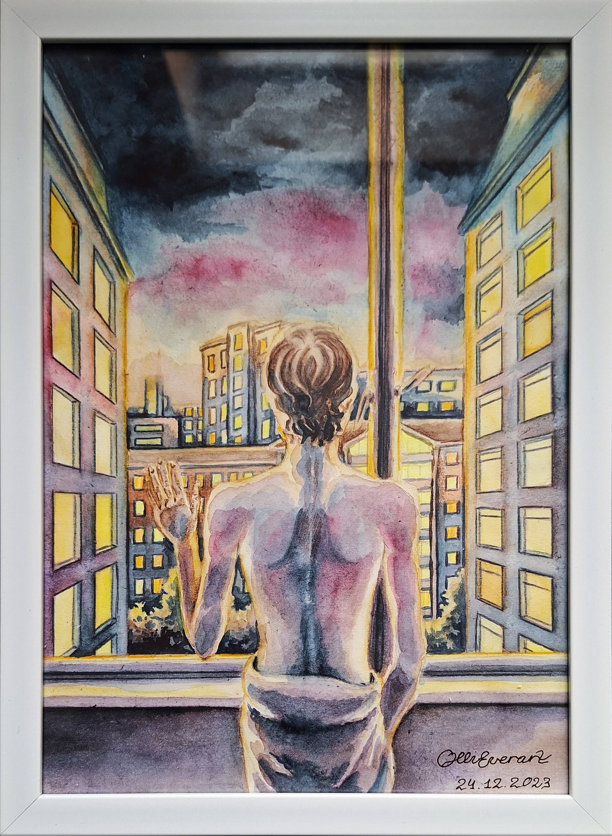 Materials: paper, colored pencils, watercolorsI created this watercolor painting as a Christmas gift for one specific person who enjoys looking out the window like this. I took a photo of it when it was already framed and put under glass, hence the reflections Size: A4 Materials: paper, colored pencils, watercolors0 Comments 0 Shares 1 Views -
