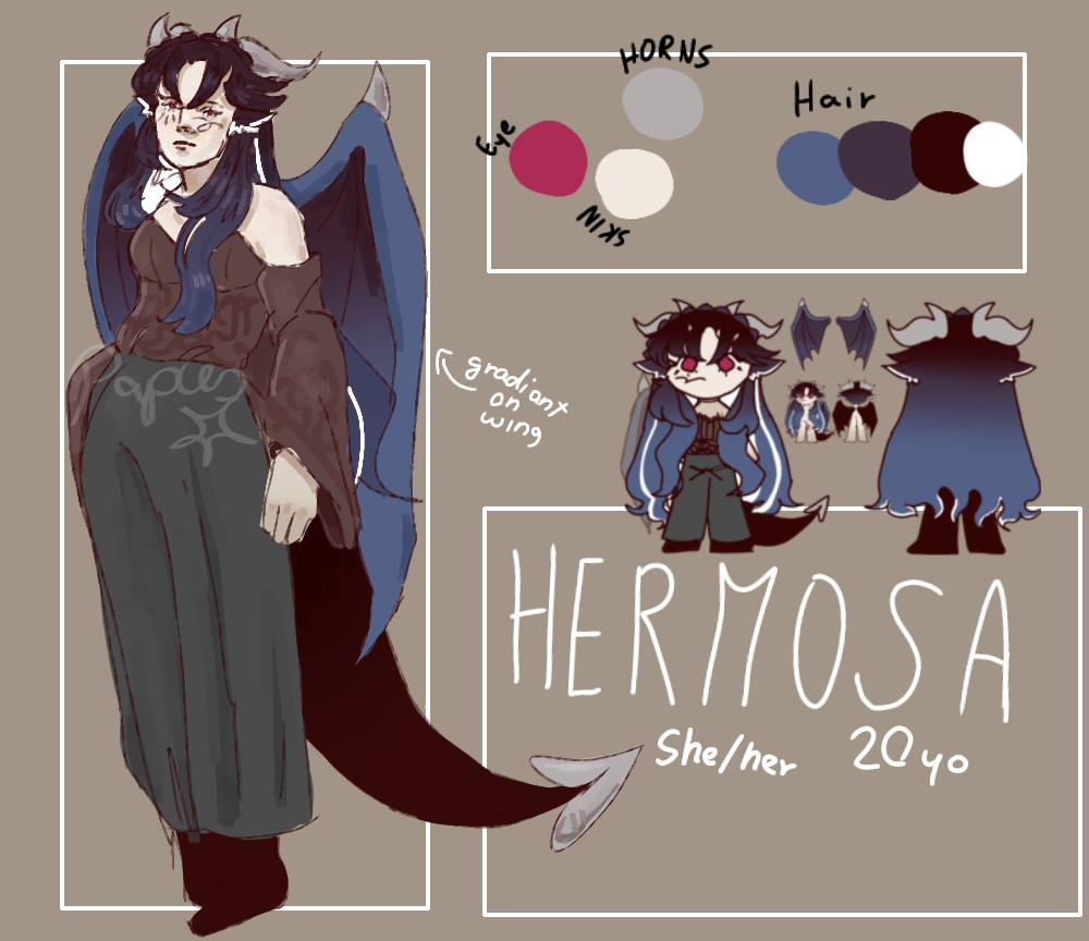 Hermosa can talk to the dieties of her World, but she was raised to worship a '' false god''. She' s also Fairly powerful.One more ref sheet (I'll post them 2 at a time) . This is Hermosa she' s also a cis woman she's a '' dragon'' (im using that word loosely). She' s more of an important character than Ardesia. I draw her a lot :33 has a sarcastic personality and strictly follows her own values. She's also pretty jugdemental toward others of her kind. Very insecure so she '' protects'' herself by being rude. Didnt have a very happy Childhood. Has 4 siblings :P Her parents have a big role in the lore . Hermosa can talk to the dieties of her World, but she was raised to worship a '' false god''. She' s also Fairly powerful.0 Comments 0 Shares 7 Views -