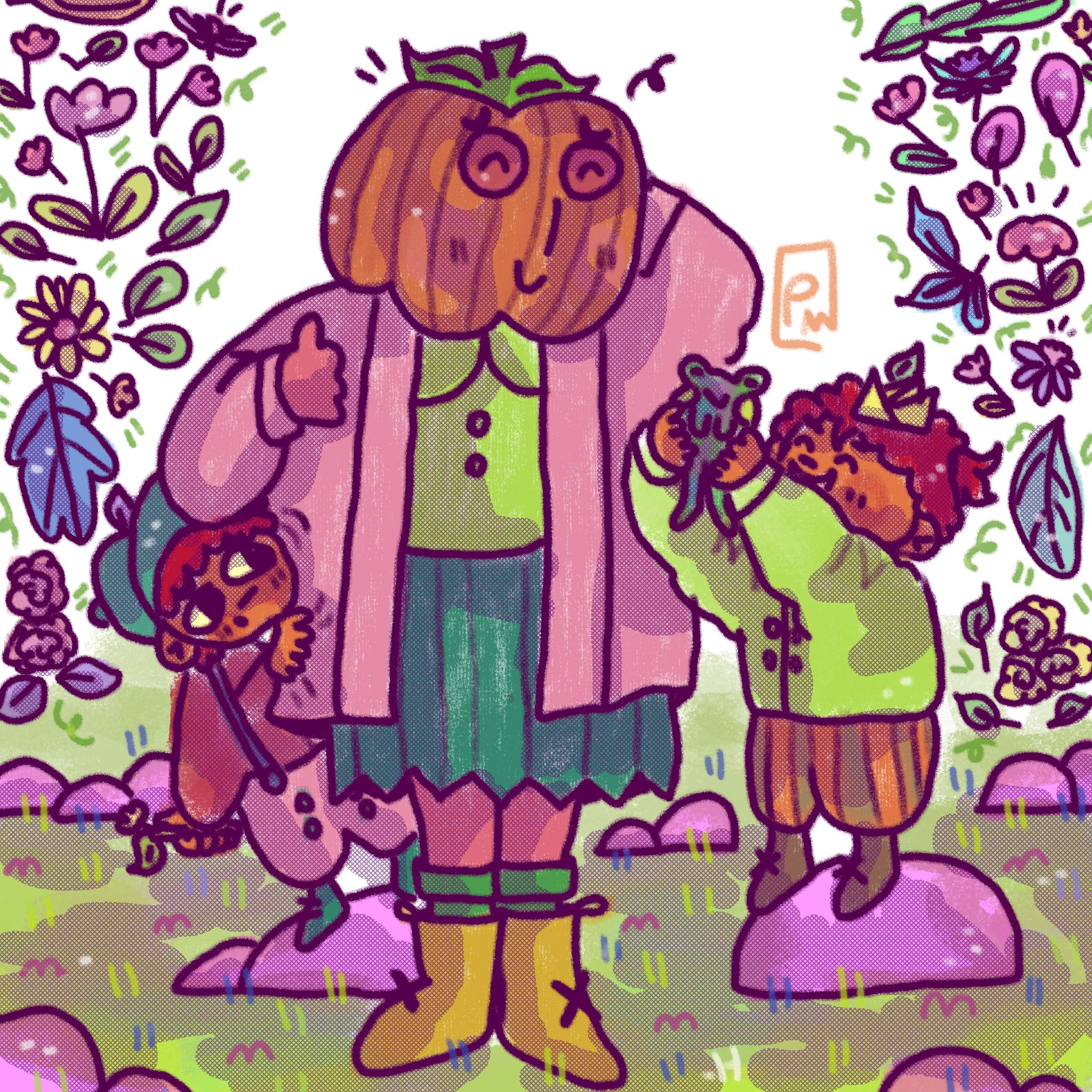 [original character illustration] Clarennaide is making pumpkin heads for halloween and is holding the head of my oc Maria who has a pumpkin head. Both wear vintage pink and orange uniforms. They are in front of a field of crops, and a green and orange sky. There is a frame of greens and stars.0 Comments 0 Shares 24 Views -