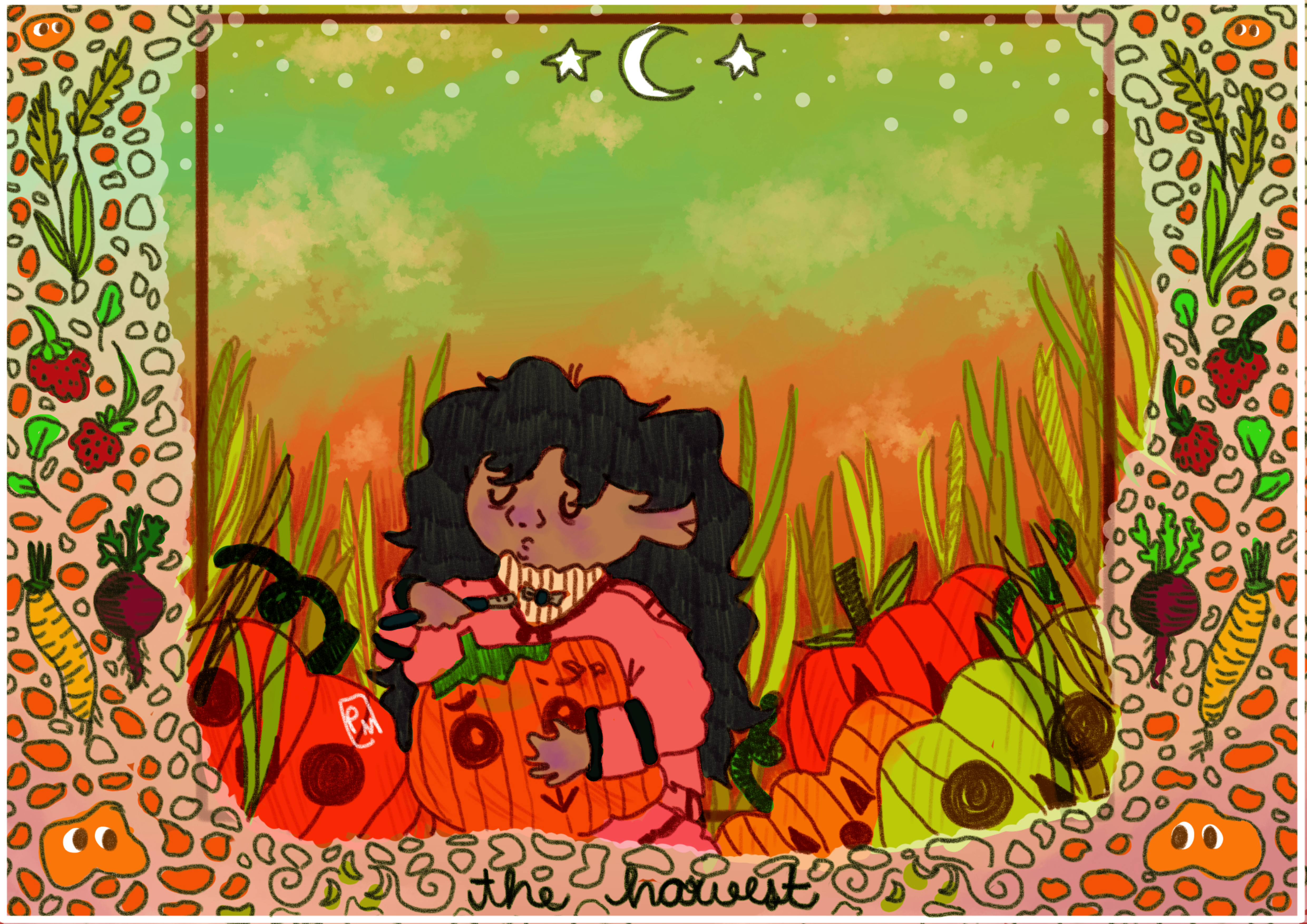 [original character illustration] Clarennaide is making pumpkin heads for halloween and is holding the head of my oc Maria who has a pumpkin head. Both wear vintage pink and orange uniforms. They are in front of a field of crops, and a green and orange sky. There is a frame of greens and stars.