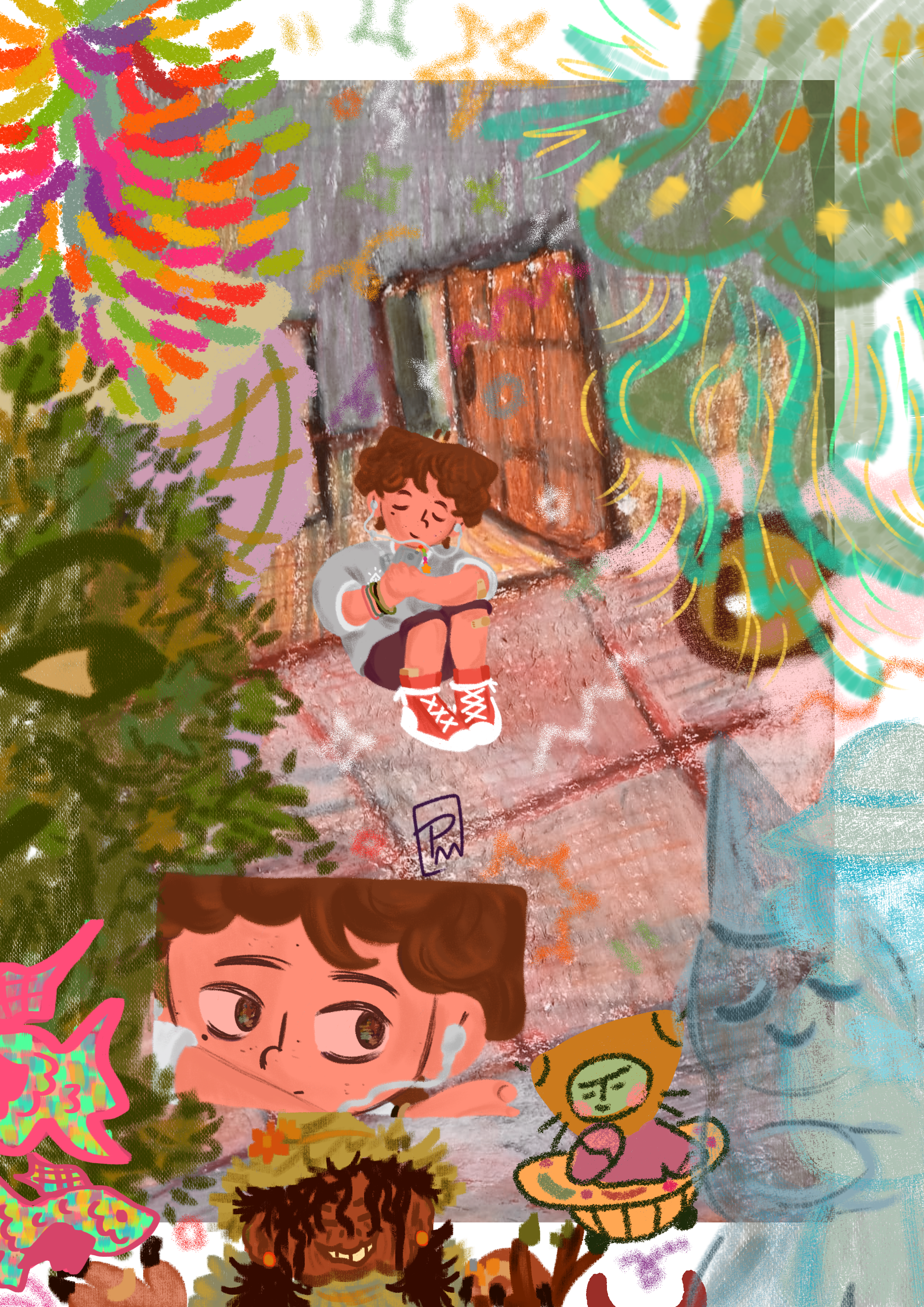 [illustration] drawing of my characters Maria, who has a pumpkin head, wears a pink cardigan, yellow boots, light green uniform blouse and blue skirt; Abe, with a light blue cap, a red blouse, pink pants and suspenders and Fabe, who wears a paper boat on his head, a light green blouse and orange and green striped pants. Abe hides in Maria in fear of the frog Fabe is holding. The background is white with colorful plants and flowers.0 Comments 0 Shares 24 Views -