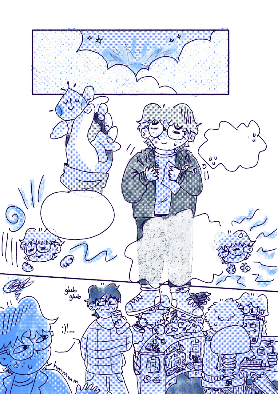 [illustration] first page of my original comic "stuck!" made with shades of blue. One morning my oc TC is talking nervously with an amigurumi from my oc paper and is embarrassed when he realizes that the other employees have seen him talking to himself.[illustration] first page of my original comic "stuck!" made with shades of blue. One morning my oc TC is talking nervously with an amigurumi from my oc paper and is embarrassed when he realizes that the other employees have seen him talking to himself.0 Comments 0 Shares 24 Views