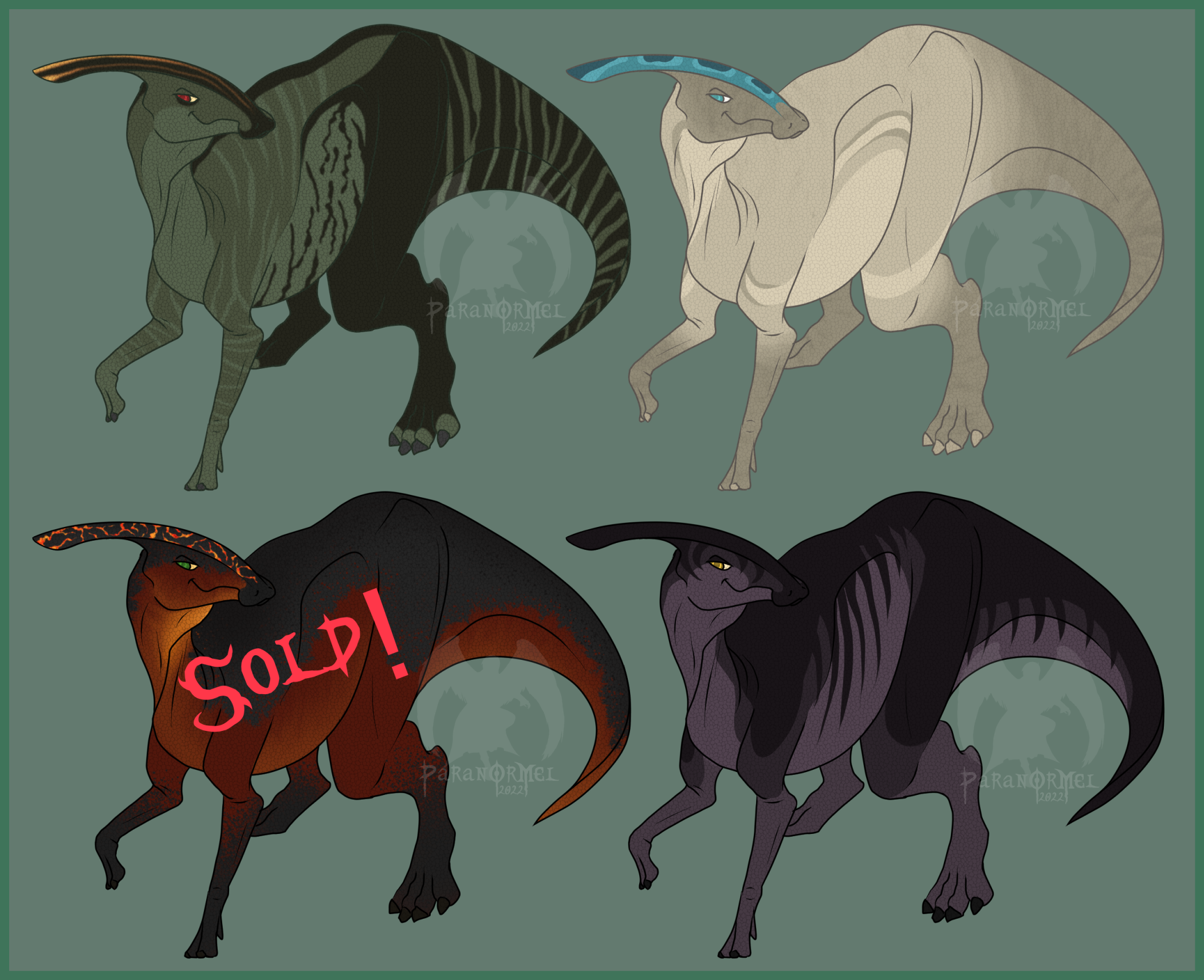 4. Violet Stripes -- OPEN!Some simple parasaurolophus adopts! $10 a piece; comment to claim and I'll dm you details. Paypal only. Once bought you'll receive a higher quality copy of your adopt and, if applicable, the character sent to you via Toyhou.se. 1. Swamp Shade -- OPEN! 2. Sandy Lynx Point -- OPEN! 3. Magma Dipped -- CLOSED! 4. Violet Stripes -- OPEN!0 Comments 0 Shares 22 Views -