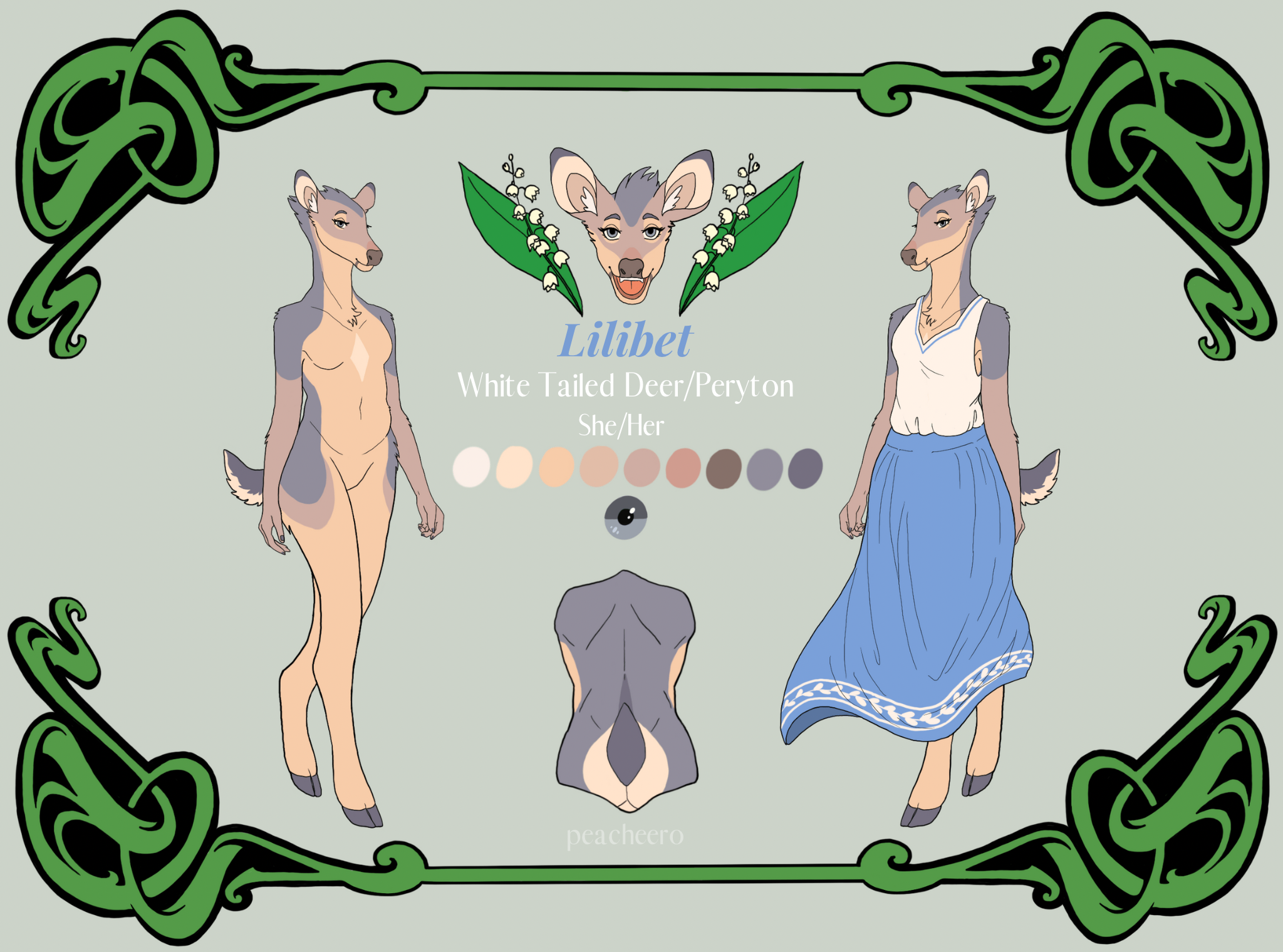 My main fursona, Lilibet's reference page. Super happy to have finished this finally! Just one thing to note, Lilibet only got minor peryton traits from her dad. She got the fangs but not the wings. They don't protrude so are hidden when her mouth is closed. Will update with Toyhouse link later!My main fursona, Lilibet's reference page. Super happy to have finished this finally! Just one thing to note, Lilibet only got minor peryton traits from her dad. She got the fangs but not the wings. They don't protrude so are hidden when her mouth is closed. Will update with Toyhouse link later!0 Comments 0 Shares 3 Views