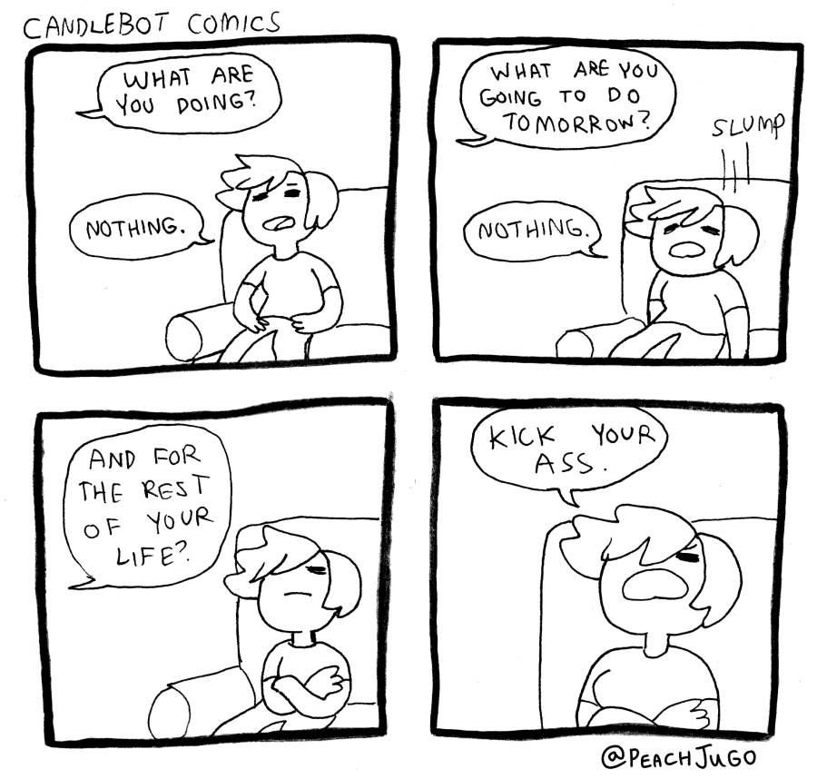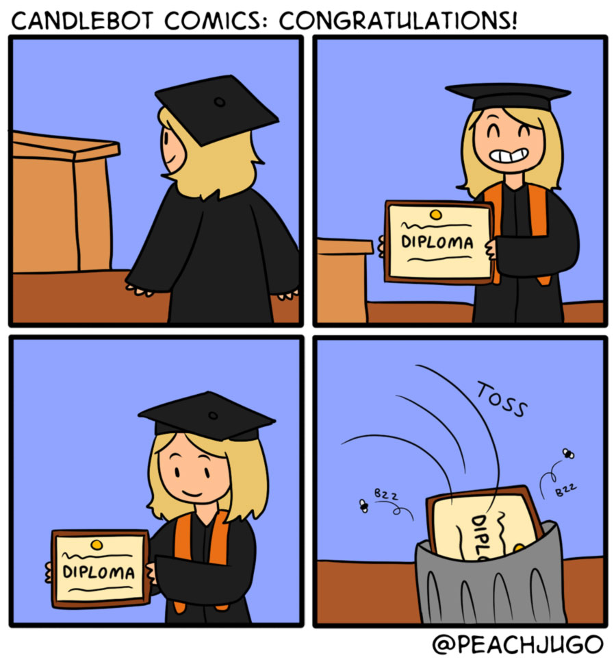 Wow! You did it! You can read this comic on my website [here](https://peachjugo.com/comic/congratulations) along with a special ~[bonus farewell comic](https://peachjugo.com/comic/goodbye-candlebot-comics)~ too! I’ve also posted a little update about what’s going on now that I’m done reposting Candlebot Comics (the answer is not a whole lot but you can [read it here!](https://peachjugo.com/blog/a-small-update)) Continue reading below for a transcript of this comic. ------ Image is a comic strip with 4 panels. Title: Candlebot Comics: Congratulations! Panel one: A girl with long blonde hair wearing a graduation cap and gown walks toward a podium. Panel two: The girl holds up her diploma, smiling like she is posing for a photo. Panel three: The girl looks at her diploma, her smile softening. Panel four: Off-panel the girl tosses the diploma into a trash can with flies buzzing around it.0 Comments 0 Shares 4 Views -