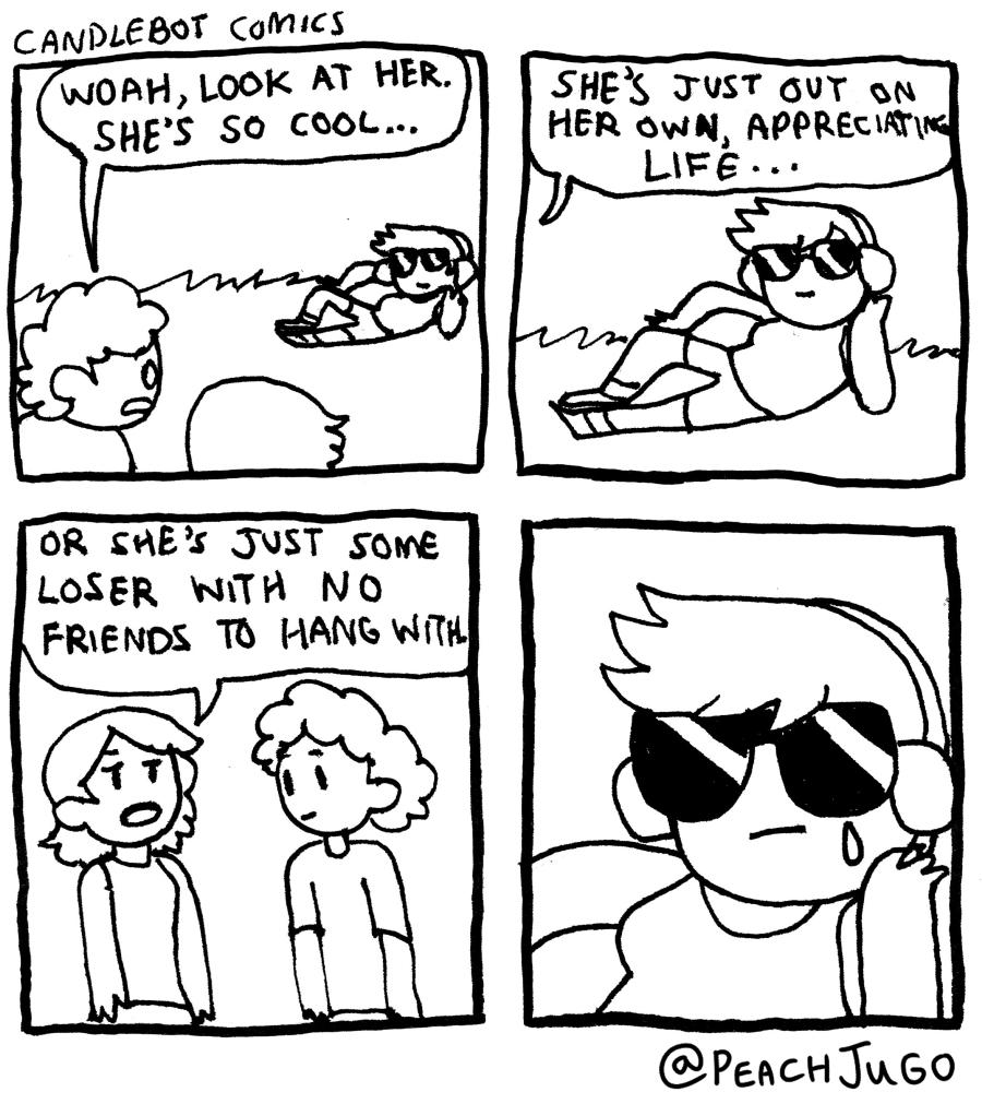 Panel four: The panel focuses on Cool Gal's face as a single tear falls down her cheek below her cool shades.too cool for friends read on my website at: https://peachjugo.com/comic/cool-gal continue reading below for a transcript of this comic ------ Image is a comic strip with four panels titled "Candlebot Comics" Panel one: Two friends are walking outside and pass a girl laying in the grass. She has short spiky hair, is wearing a pair of big headphones and a cool pair of shades. One of the friends looks at her in awe, saying, "Woah, look at her. She's so cool..." Panel two: The panel focuses on the cool-looking gal as her admirer continues, "She's just out on her own, appreciating life..." Panel three: The other friend looks completely unimpressed and responds, "Or she's just some loser with no friends to hang with." Panel four: The panel focuses on Cool Gal's face as a single tear falls down her cheek below her cool shades.0 Comments 0 Shares 2 Views -