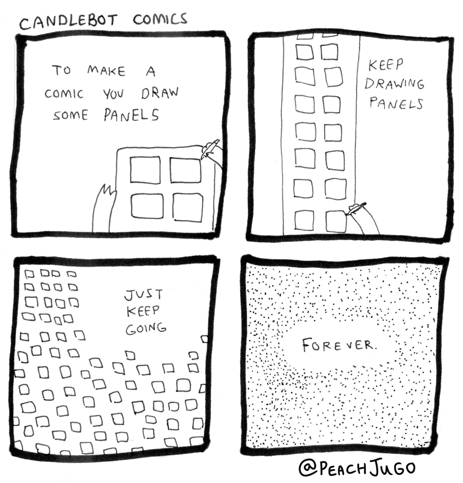 Panel four: Text reads, "Forever." The panels surrounding this text are so small they appear as crude stippling.See title. read on my website at: https://peachjugo.com/comic/how-to-draw-comics continue reading below for a transcript of this comic ------ Image is a comic with four panels. Panel one: Text reads, "To make a comic you draw some panels." A hand has drawn four panels on a sheet of paper. Panel two: Text reads, "Keep drawing panels." The sheet of paper is shown to be extremely long with many more panels drawn below the first two. Panel three: Text reads, "Just keep going." The text is surrounded by small square panels. Panel four: Text reads, "Forever." The panels surrounding this text are so small they appear as crude stippling.0 Comments 0 Shares 3 Views -