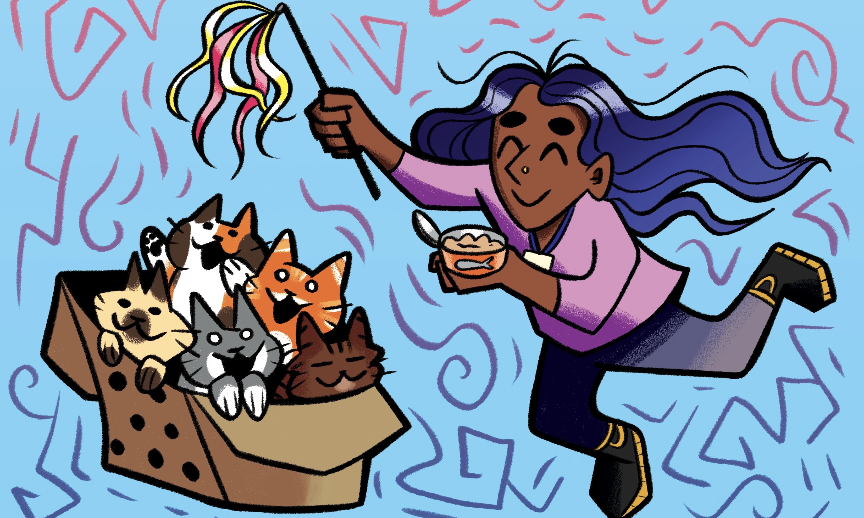 Image is an illustration of a girl playing with a box full of content kittens against a blue background with geometric shapes surrounding them. Their are five cats in the box, a siamese cat, a brown tabby, an orange tabby, a gray cat with white spots, and a calico, all in varying states from sleepy to playful. The girl playing with them has her eyes closed and is happily waving a ribbon wand toy over the box while holding a can of cat food in her other hand. She has long, flowing violet hair, a gold nose piercing, and dark brown skin. She is wearing a long sleeve purple shirt, dark blue pants and black combat boots with yellow accents.box! of! cats! image description below ------ Image is an illustration of a girl playing with a box full of content kittens against a blue background with geometric shapes surrounding them. Their are five cats in the box, a siamese cat, a brown tabby, an orange tabby, a gray cat with white spots, and a calico, all in varying states from sleepy to playful. The girl playing with them has her eyes closed and is happily waving a ribbon wand toy over the box while holding a can of cat food in her other hand. She has long, flowing violet hair, a gold nose piercing, and dark brown skin. She is wearing a long sleeve purple shirt, dark blue pants and black combat boots with yellow accents.0 Comments 0 Shares 4 Views -
