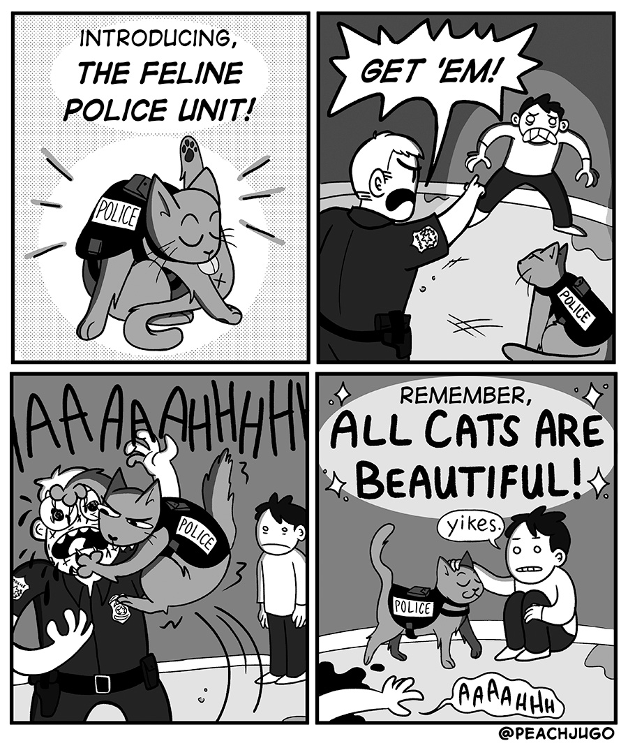 Panel four: The policeman writhes in pain off-panel with only his hand and a puddle of blood visible. The frightened man is sitting on the ground petting the police cat, who looks very content. The man stares at the carnage and says, "Yikes." Text above reads, "Remember, all cats are beautiful!"Comic submission for [Scarfff Comics'](https://www.instagram.com/scarfffcomic/) police issue, check em out! ------ Image is a grayscale comic with four panels. Panel one: A cat stretches it's leg up in the air and licks it's butt. It is wearing a black utility vest that reads "Police." Text above the cat reads, "Introducing, the feline police unit!" Panel two: In a dark alleyway an angry looking police man corners a frightened man. The policeman points toward the man yelling, "Get 'em!" The police cat is sitting on the ground looking bored. Panel three: The police cat jumps on the policeman and begins scratching his eyeballs and biting his face. The policeman screams in pain, his face covered in scratches and blood. The frightened man from before stares blankly. Panel four: The policeman writhes in pain off-panel with only his hand and a puddle of blood visible. The frightened man is sitting on the ground petting the police cat, who looks very content. The man stares at the carnage and says, "Yikes." Text above reads, "Remember, all cats are beautiful!"0 Comments 0 Shares 2 Views -