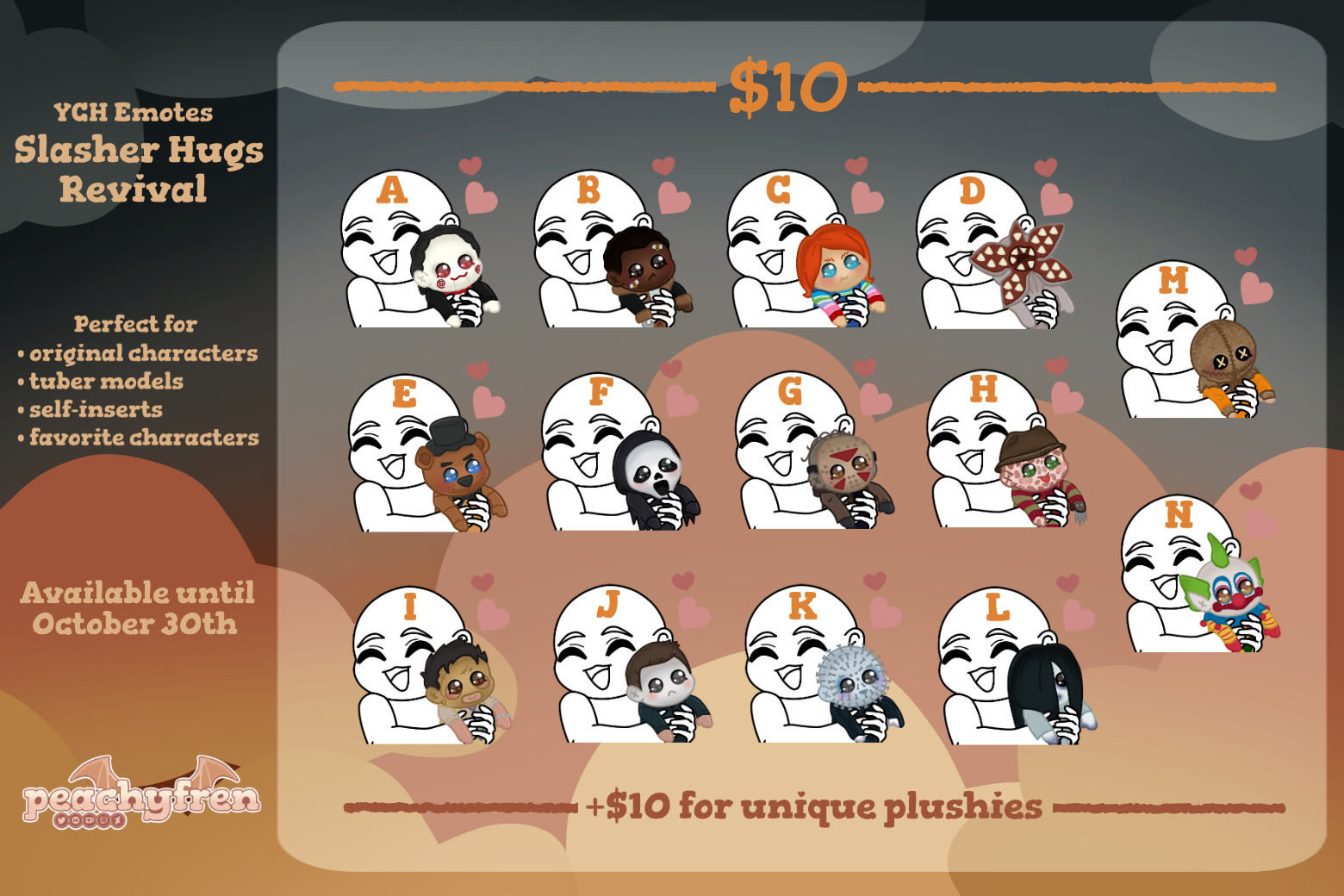 Thank you again to everyone who ordered last Halloween season!• 10 each • Available with 14 different horror slashers • Can feature any OC, tuber model, favorite character, or self-insert • +10 for unique slasher plushies • Heart color can be edited per request Get yours today! Available until October 30th, 2023. https://ko-fi.com/peachyfren/commissions https://fiverr.com/s/2oEYWV Thank you again to everyone who ordered last Halloween season! ❣️0 Comments 0 Shares 12 Views -