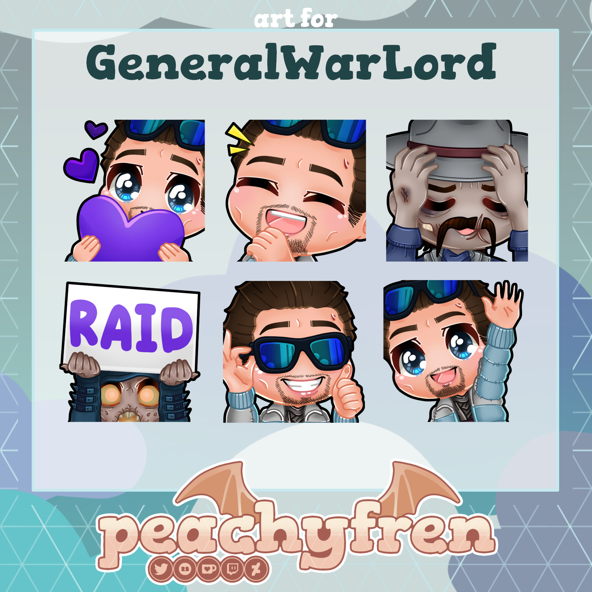Get your own stream/social graphics here: ko-fi.com/peachyfren/commissionsSix new emotes for The General- you've been awesome to work with! I had a super fun time bringing your mains to life, especially Deathslinger in the NOT LIKE THIS pose. :D Get your own stream/social graphics here: ko-fi.com/peachyfren/commissions0 Comments 0 Shares 10 Views -