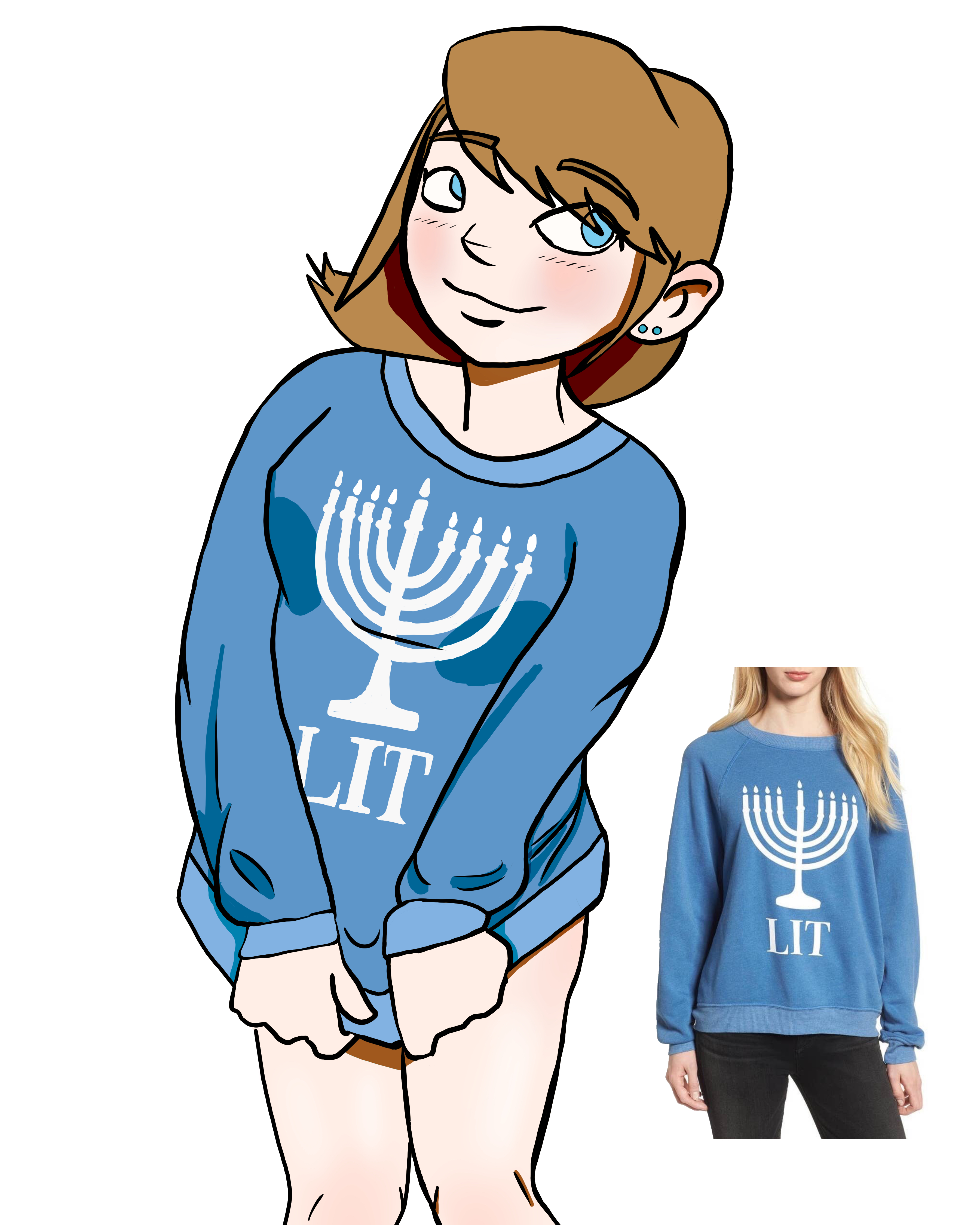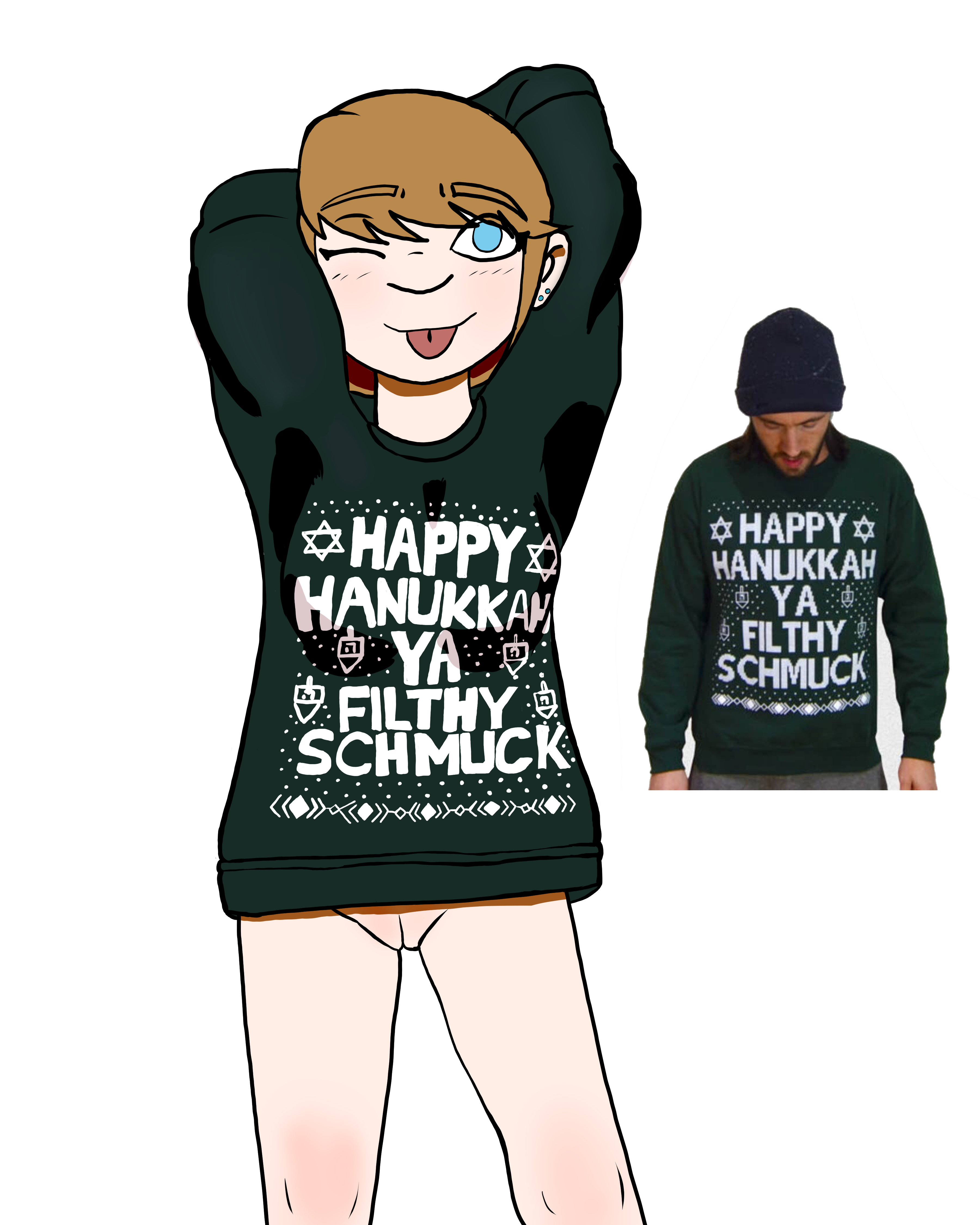 Description: Young Jewish woman (Nikki) wears a forest green sweater with white dots, a geometric pattern on the lower half, dreidels, and the words “ Happy Hanukkah Ya Flithy Schmuck”. You can see her outer lower half/ vagina, and she sticks her tongue out, with a playful wink.Description: Young Jewish woman (Nikki) wears a forest green sweater with white dots, a geometric pattern on the lower half, dreidels, and the words “ Happy Hanukkah Ya Flithy Schmuck”. You can see her outer lower half/ vagina, and she sticks her tongue out, with a playful wink.0 Comments 0 Shares 3 Views