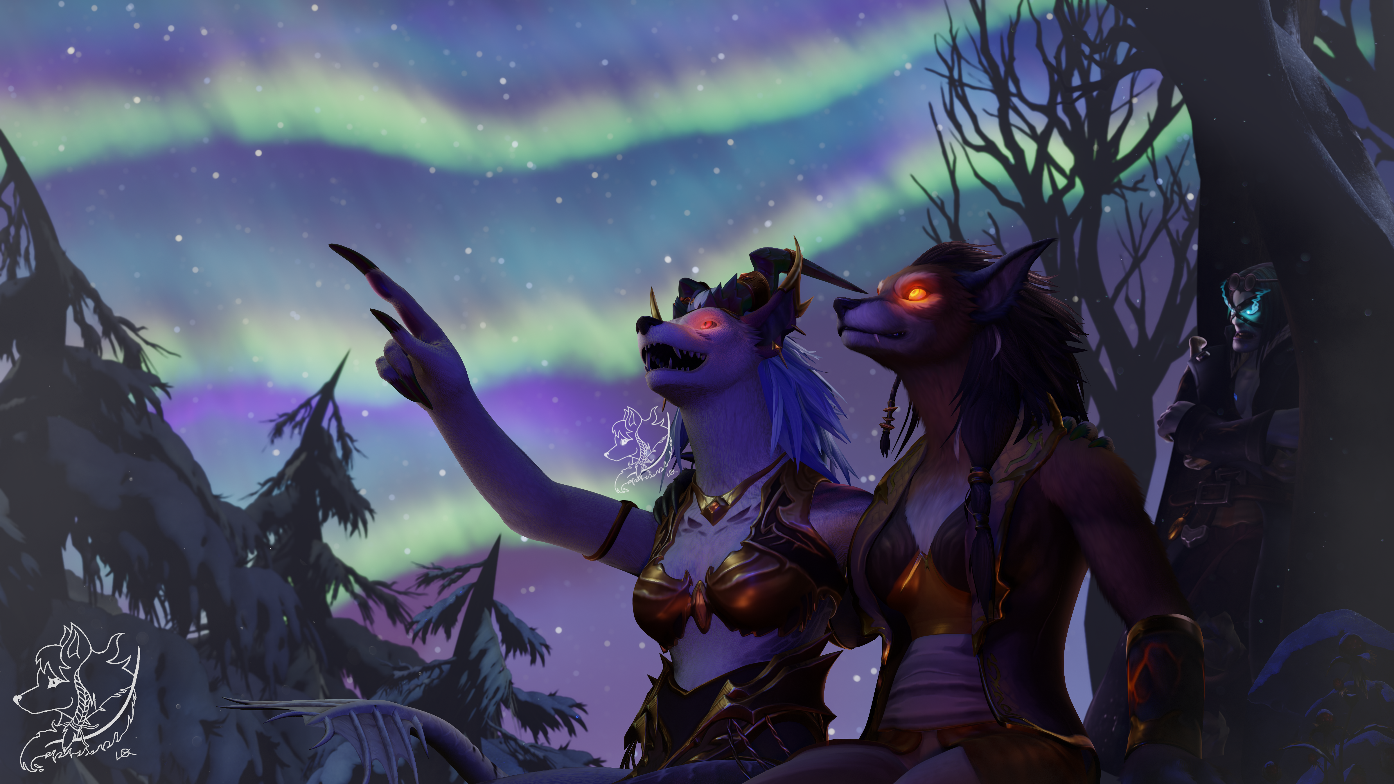 As mentioned in the beginning there will be an animated version with a moving aurora, snowfall, and Pete's eye vapors. I just have the unfortunate job of piecing together 600 frames, as I naturally want Phe to have her fur texture.**Edit - 4-20-23** Animated variant is FINALLY done: https://www.deviantart.com/pheonixxfoxx/art/Two-s-Company-Three-s-A-Crowd-Animation-Edition-958994343 https://twitter.com/PheonixxFoxx/status/1649197316828725252 Holy crap on a cracker, this piece was started at the beginning of November. At this point, it is almost the end of January and non-animated version has finally been completed! Humble apologies for that, but the holidays ended up being a bit rough as most know. Technically, this is the last piece of 2022, but also my first creation of 2023. Two splendid ideas on [my extensive list](https://www.deviantart.com/pheonixxfoxx/journal/The-Future-of-My-Blendering-874360095) were intentionally included for this one: **Pete's Jealousy** **Pete and Phe watching the Aurora** After the events of Shadowlands, before our couple departed for the Dragon Isles, Phe wanted to take in the rare beauty of Drustvar's aurora borealis with her man. She mentioned this to her new friend, Marsala who had just returned with her newly chosen visage form. Apparently, Marsala had never taken in the dazzling splendor of an aurora before, and commented on how beautiful it must truly be. Therefore, Phe politely invited her to come along, and she happily joined. Pete and Phe's relationship, isn't always sparkling sunshine and lollipops. In fact, Pete has a severe issue with violent jealousy. It is so terrible, that Phe has had to get in the middle of his blade and the unfortunate person who happened to have focused some attention on her. Luckily Pete's first meeting with Marsala was a little less intense, as he merely did a grumbling sneer and walked away. Judging by Pete's appearance in this scene, he is rather displeased and is pouting in the corner sort of speak. Don't worry, though, Phe will make it up to him. As mentioned in the beginning there will be an animated version with a moving aurora, snowfall, and Pete's eye vapors. I just have the unfortunate job of piecing together 600 frames, as I naturally want Phe to have her fur texture.0 Comments 0 Shares 22 Views -