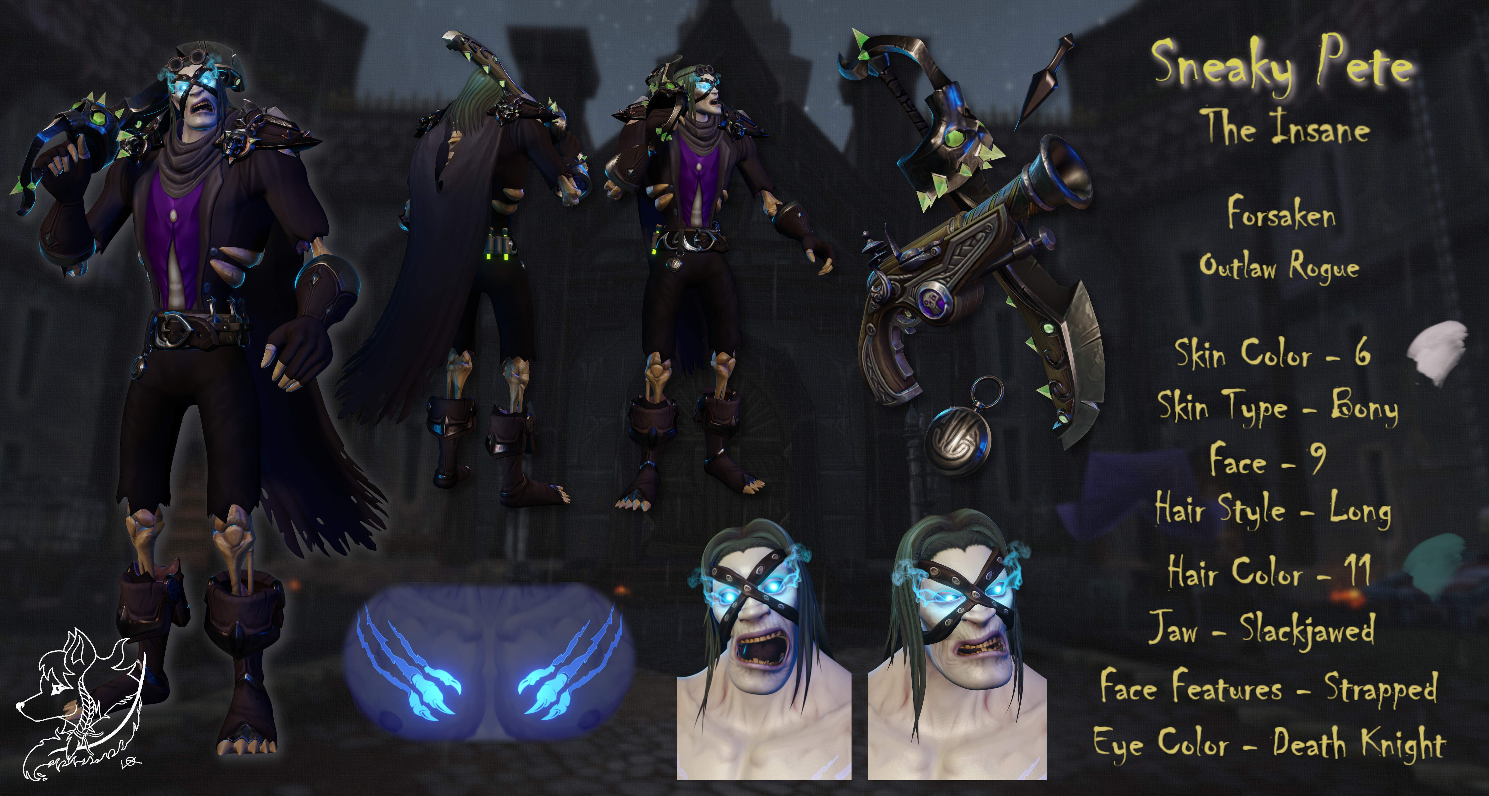 -When sailing with "Greenbelly's Raiders," Pete's memory slowly began to return.Here is that other outfit reference sheet for Sneaky Pete. It is based on an in-game outfit I piece together for him back in March. While it isn't exactly "piratey," I fell in love with how good it looks. ------ **Sneaky Pete the Insane:** **Given Name** - Peter Vannacutt **Race** - Forsaken (He is based on the island expedition NPC of the same name) **Birthplace** - Gilneas **Companion Pets** - Cap'n Crackers and Jiggles (Fritter) **Relatives** - _Brother:_ Richard (Death Knight Worgen) _Sister:_ Rosemary (Whereabouts Unknown) **Wife** - Pheonixxfoxx, their relationship is monogamous. **Personality** - A tad on the insane side, a loose cannon, stabs first and asks questions later. Shouts his name loudly before attacking. Very overprotective of his wife, has an issue with jealousy. **Unique Features** - Has the same eyes as a Death Knight, just a deeper shade o' blue. Due to joining the Night Fae Covenant, he choose the Velociraptor Soulshape. Upon doing so, an iridescent glowing tattoo appeared permanently on his chest. **WoW Model Viewer** - Pete's skin color is #5, the one with the purplish tongue. **Armory Link** - [Pete's Armory](https://worldofwarcraft.blizzard.com/en-us/character/us/area-52/Sneakypet%C3%AB) ------ **Important Backstory Points:** -In life Pete worked on a fishing boat. -A feral cat who Pete dubbed "Fritter" lived on the boat. -Pete's brother was a well respected doctor, who vanished after being summoned to see a patient outside the walls. -Pete was cut down by the Forsaken the day Gilneas fell. -Phe found his body and gave into the Worgen curse. -Last thing Pete saw before dying was Phe's transformation. -Upon resurrection into Undeath, Pete had no memory of who he was. -Pete was selected to be trained by the Deathstalkers in the ways of the Rogue. -After the events of Legion, Pete joined up with an odd crew of misfits and cutthroats known as "Greenbelly's Raiders" for the sea called to him. -When sailing with "Greenbelly's Raiders," Pete's memory slowly began to return.0 Comments 0 Shares 43 Views -