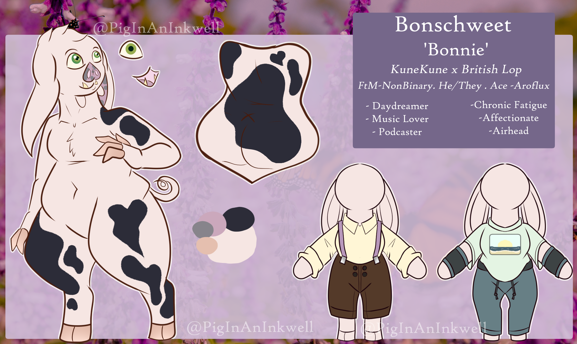 This is Bonschweet. Softhearted little piggo who runs a podcast with a close friend. He wears comfy clothes for sensory reasons and wears PJs pretty much all the time since he works from home. He suffers from chronic fatique and naps often throughout the day when he can.Referance for a new pig sona. Decided to make myself more pig fursonas because it makes me feel happy. This is Bonschweet. Softhearted little piggo who runs a podcast with a close friend. He wears comfy clothes for sensory reasons and wears PJs pretty much all the time since he works from home. He suffers from chronic fatique and naps often throughout the day when he can.0 Comments 0 Shares 3 Views -