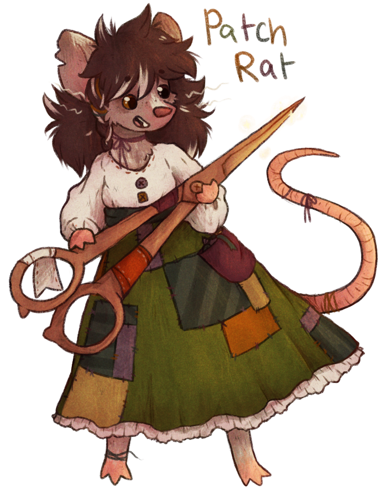 back to posting some old art, wanna try n have it not just on discord. this is my ratsona dart~! that patch rat! her fave food is digestive bickies