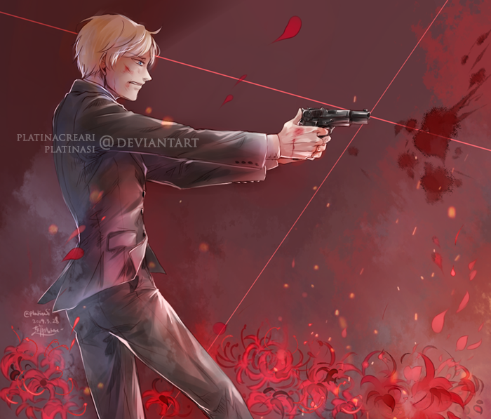 Old art of a friend's OC, who is a mafia boss. I just realized I never posted this anywhere other than Twitter, wow :'D The facial anatomy is kind of meh but I am still very proud of the way I painted the clothes around the waist/hips. Also the spider lilies in the BG! hoho