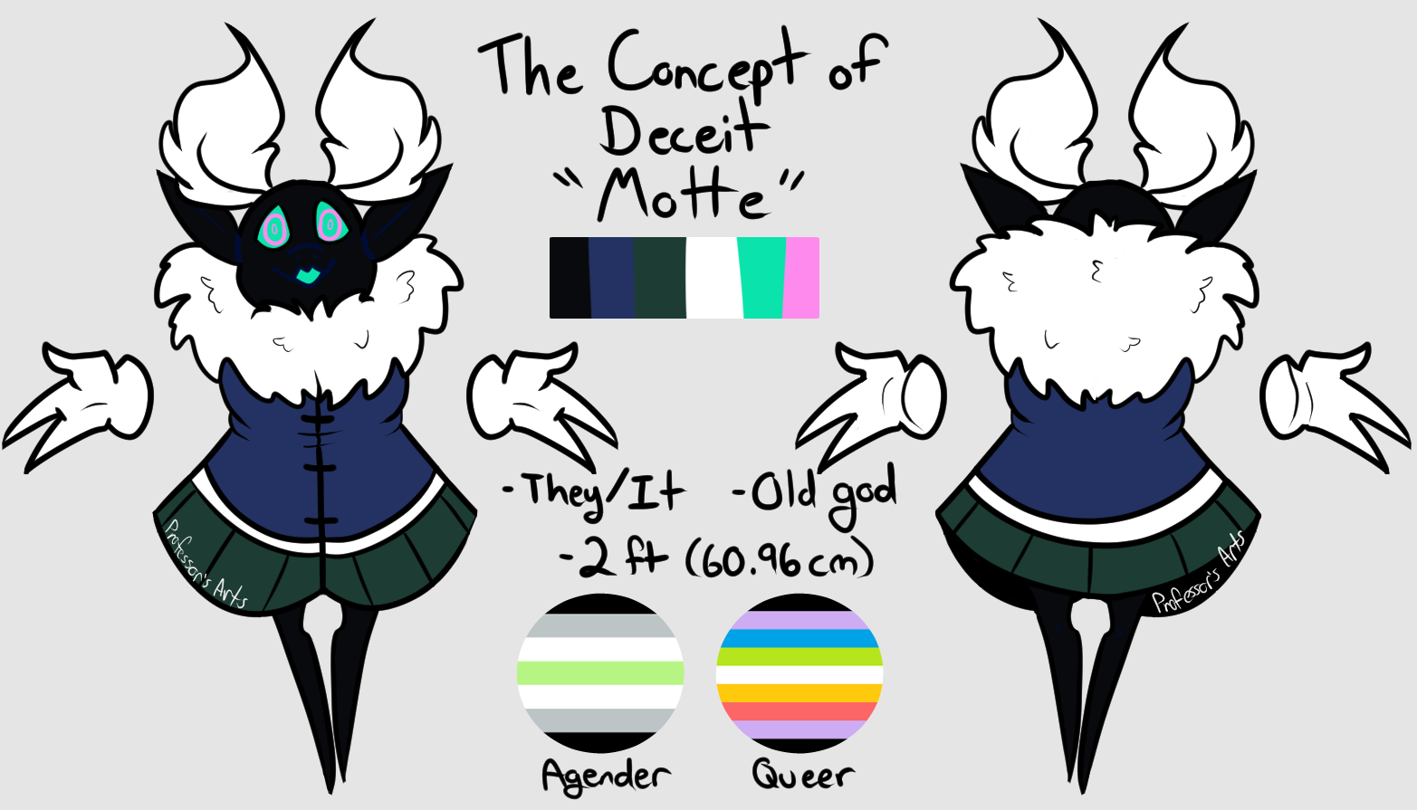 A simple reference sheet for my original character Motte! An ancient god of Deceit, although they have strayed from their intended purpose to just experience all the the universe has to offer. Very friendly, even to those who probably don't deserve it... if you do manage to get on their bad side, it is not good for anyone.A simple reference sheet for my original character Motte! An ancient god of Deceit, although they have strayed from their intended purpose to just experience all the the universe has to offer. Very friendly, even to those who probably don't deserve it... if you do manage to get on their bad side, it is not good for anyone.0 Comments 0 Shares 38 Views