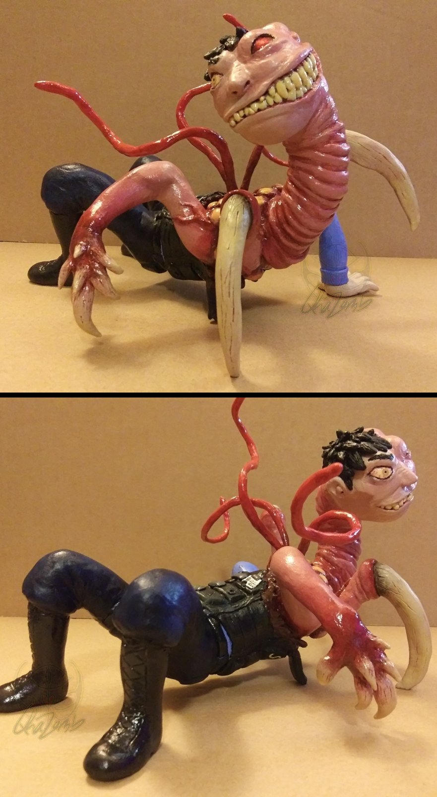 made him a bit more monstery this time, and also didn’t forget his vest and gun holster;;; i imagine this is right after a soldier or something attacked him, damaging his head and left shoulder area, followed by thingrey regrowing those damaged parts to retaliate. and also scare the shit out of the guy that shot him. probably a lot of ‘time to be mean’ blue-to-green pouring out of his mouth too, heh. gave him a random vortigaunt eye since he’s probably assimilated a couple of xen critters while they’re all dealing with the rescas. those big claw limbs were probably made using headcrab dna, too. (i didn’t think about it until after having already started painting, but i should’ve made his left eye socket full of a bunch of little eyeballs, like a houndeye’s. that wouldda been cool/freaky. ah well) made with sculpey and cosclay, painted with acrylics and sealed with sculpey glaze and mod podge. you can find more angles of this guy on [my tumblr](https://qhazomb.tumblr.com/post/716151417423970304/thingvrai-benry-thing-v2-because-i-wasnt)0 Comments 0 Shares 12 Views -