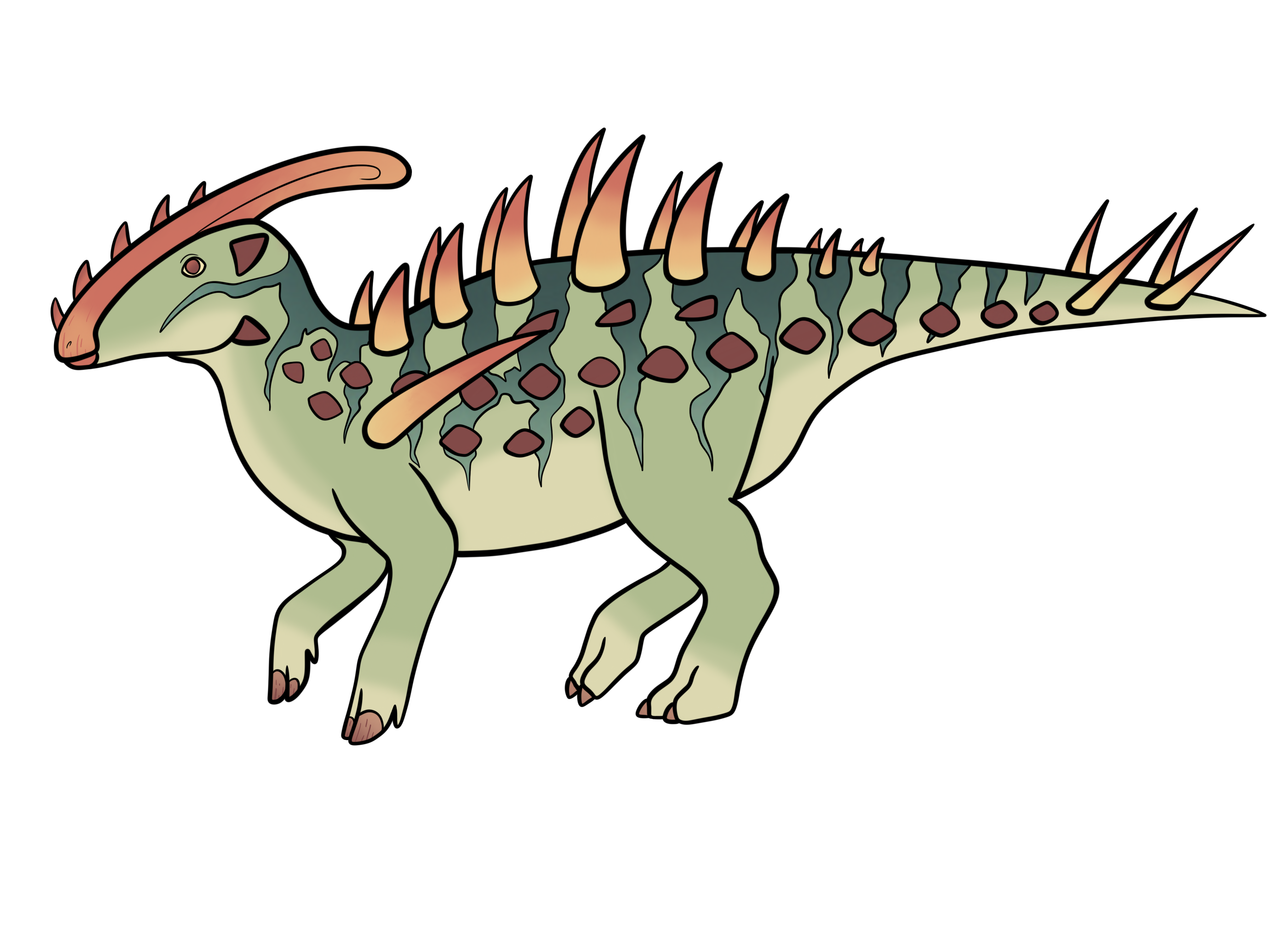 This is a redesign/update (second image) to a Jurassic World Evolution inspired hybrid I made back in 2019 (first image). I updated the overall shape to look more like a hadrosaur (it seems very theropod-like in the original drawing) and updated the kentrosaurus spikes.