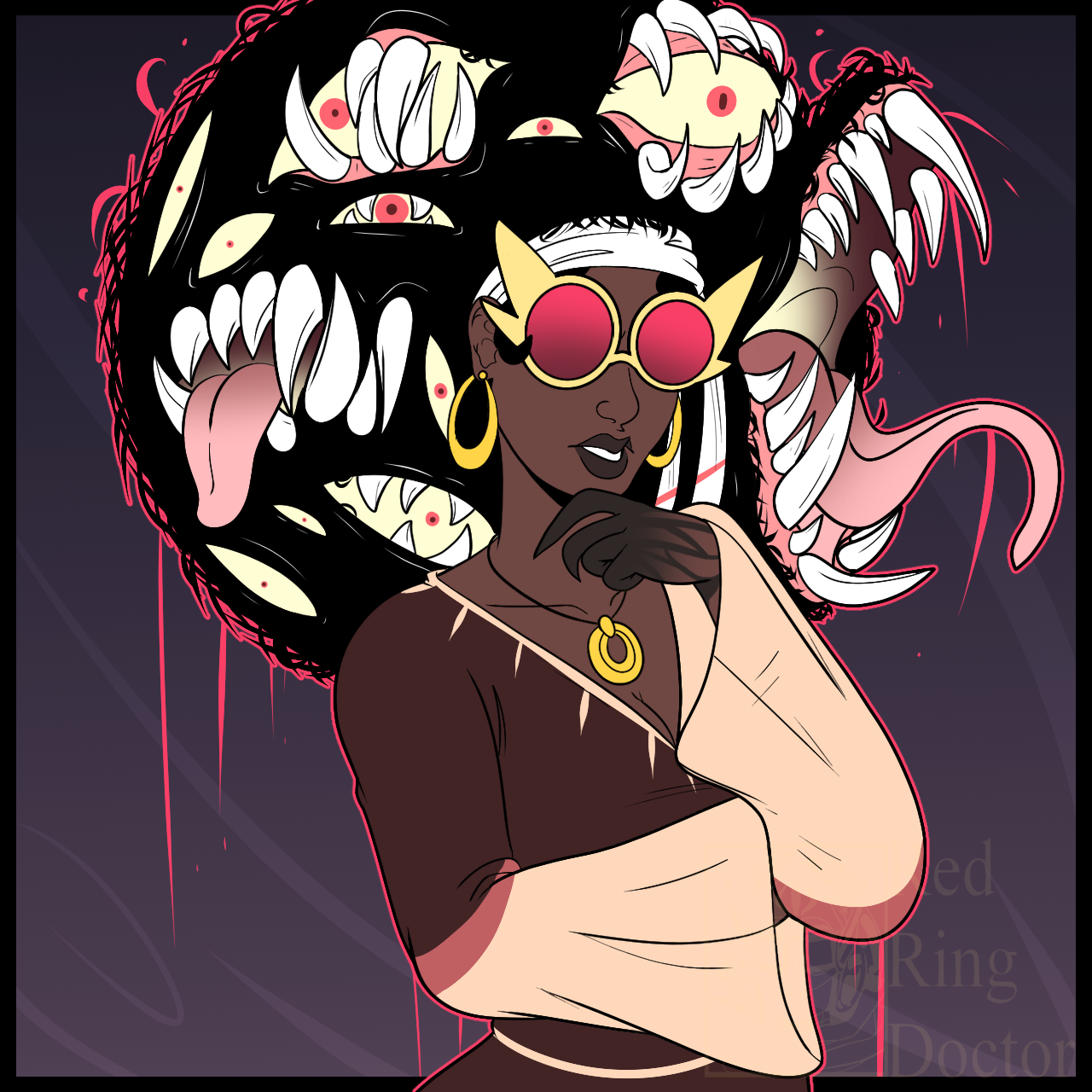 This drawing was based on an ask from a user on Tumblr. They were asking if they could kick poor Connor and Disco wasn't happy to hear about this. pff This is what happens when she is getting upset, the eyes in her hair, become teeth, and they will bite.