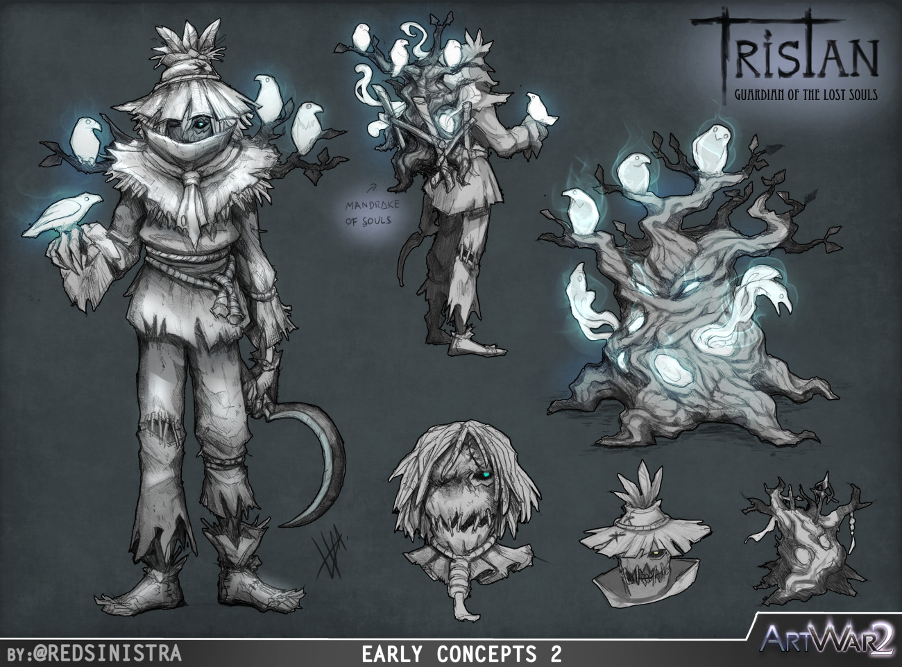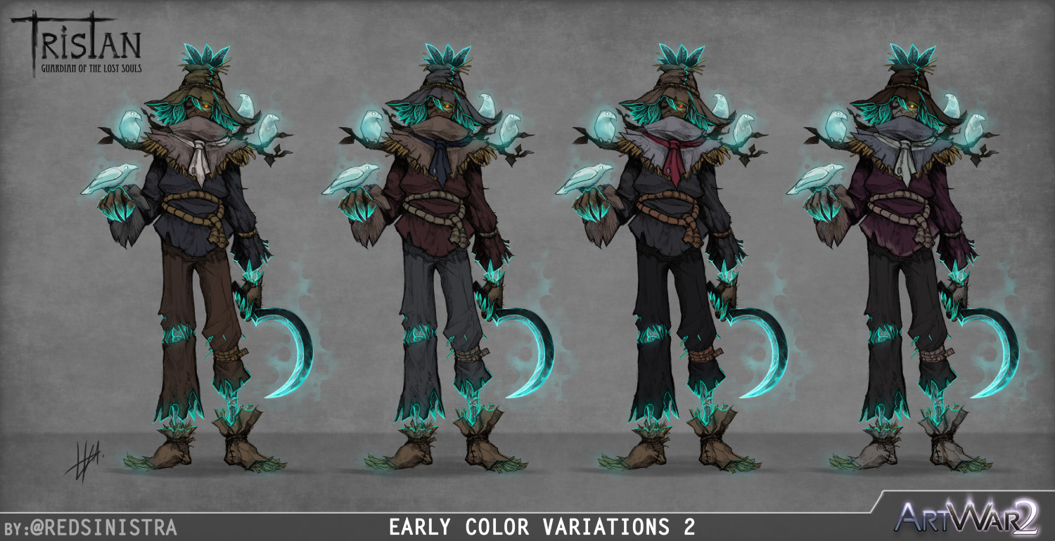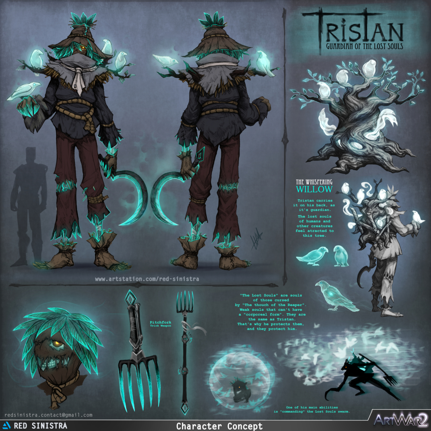 All the process of the character design of Tristan. Entry for Art War 2 (hosted by Cubebrush) ------ BIO: Side: DARK Name: Tristan, The Guardian of the Lost Souls Story: Cursed by the "Touch of the Reaper", Tristan found himself without memories of his past, just little glimpses of his human former-self. Wherever he roams his companions are sure to follow; white crows or "lost souls" as he calls them. His reason to fight is to remain "alive" (if you can call it that way) and protect the white crows, weaker souls that had no chance to find peace, and no chance to become stronger beings either. Maybe one day he'll find a way to release them from the curse, until then he'll be their guardian. "Once the Reaper asked: - Why would you keep these weak souls with you? - - Why not, master? They are just like me ... Lost souls- The Guardian replied. -" ------ Forum Link: https://forums.cubebrush.co/t/artwar-2-2d-tristan-the-guardian-of-lost-souls-redsinistra/5275?u=redsinistra ------  ------  ------  ------  ------ 0 Comments 0 Shares 70 Views -