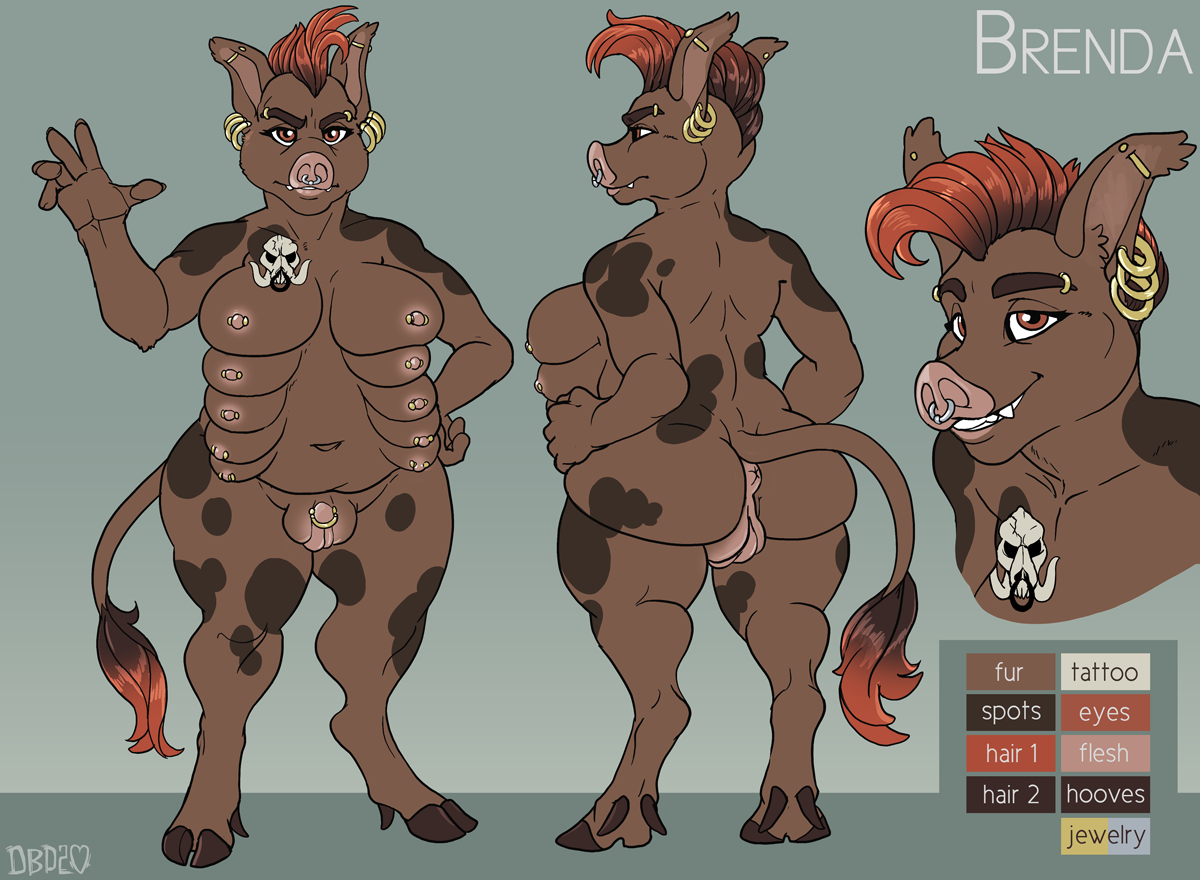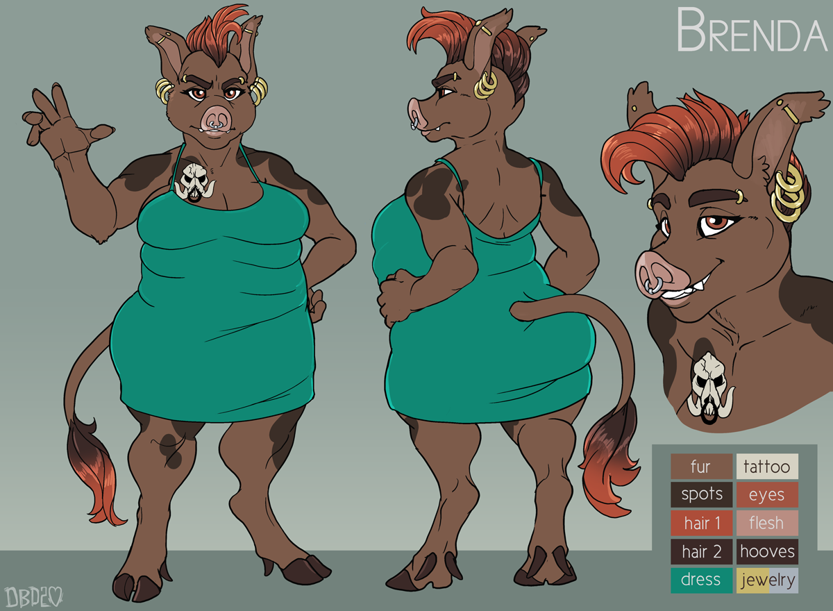 Brenda, as you likely guessed, is my character.It only seemed fitting to have my first post here on Inkblot be the reference sheet for my porcine gal, Brenda. A mature boar gal with a somewhat stubborn, but secretly sweet, personality, Brenda Reynolds lives a big city life, but likes to hike and see what the wilds can offer her whenever business isn't calling her. Brenda uses She/Her pronouns, please be respectful of that. Thanks! Art is care of Dizzy By Design (DBD) Brenda, as you likely guessed, is my character.0 Comments 0 Shares 2 Views