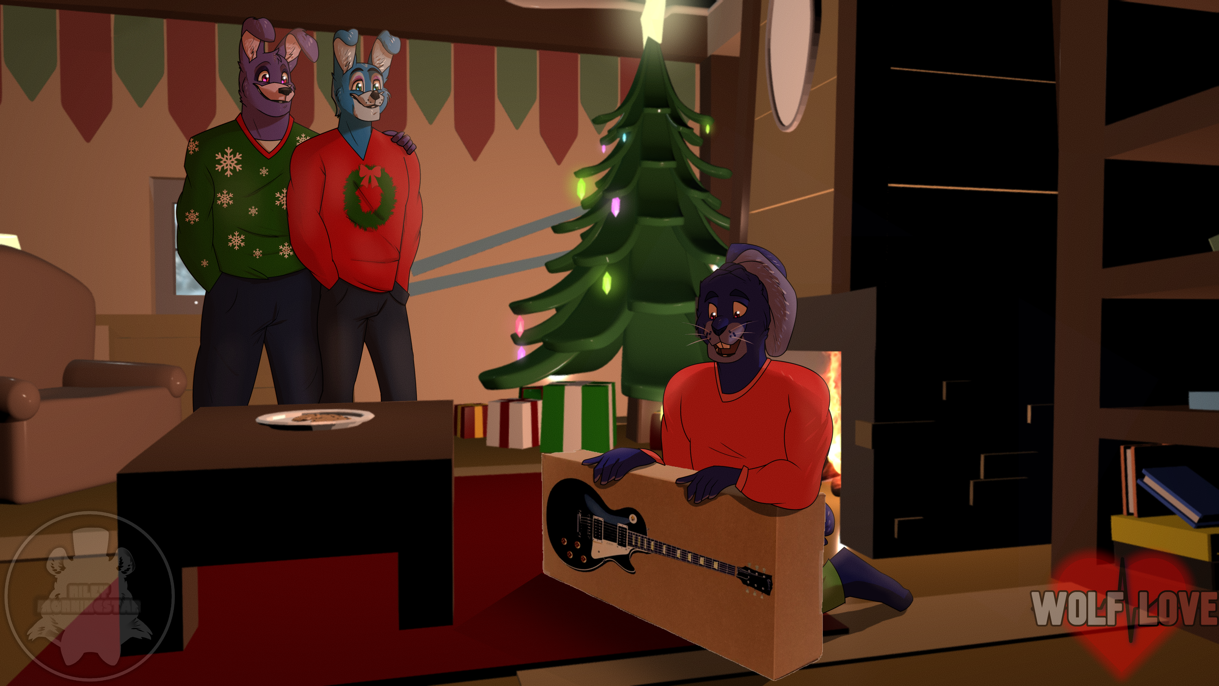 here we see the Bonnies Bonnie, Bonnifacio (Toy Bonnie) and their adopted son Kris (Glamrock Bonnie all in their home on Christmas morning, they watch proudly as their son opens his gift, a electric guitar, something Kris always wanted since he was little since he wants to follow in his fathers footsteps of being a musician.
