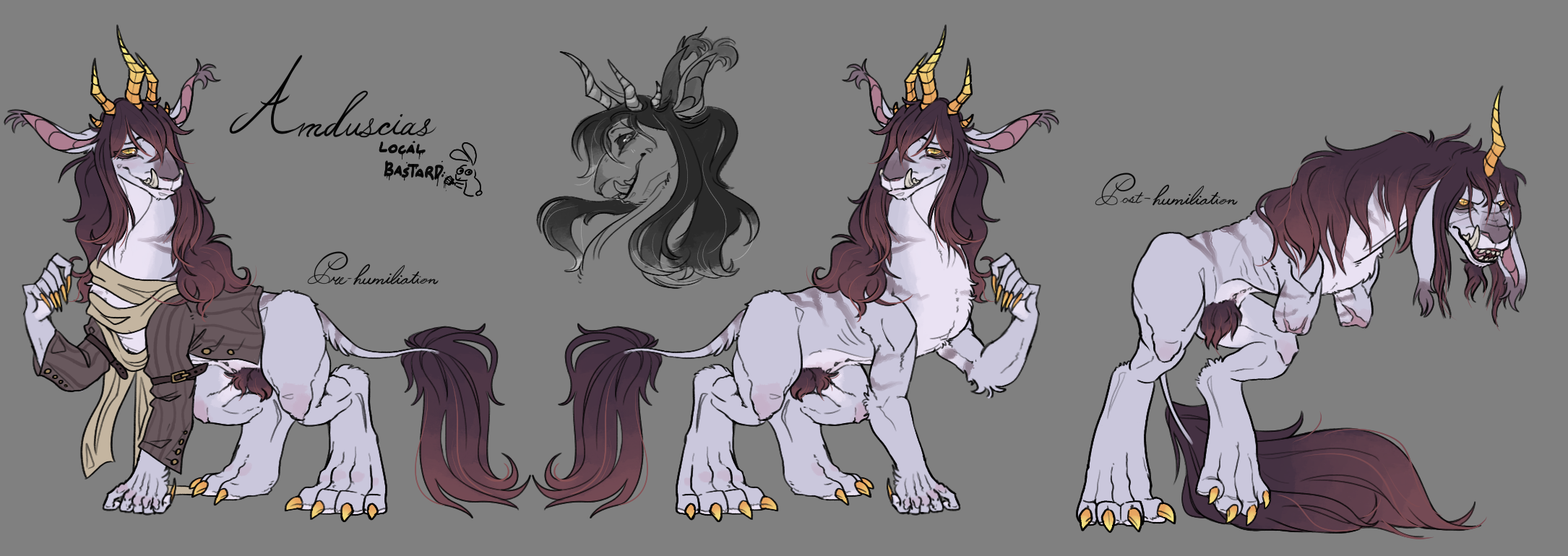 A more fleshed out reference of my boy Amduscias, now with an actual name and him pre and post humliation. He was originally for Satellite City, but with the August Few now out I have to do some tinkering with his backstory! I still haven't read the new book yet.. I need to save up to get the new juicy lore. Still can't wait though!