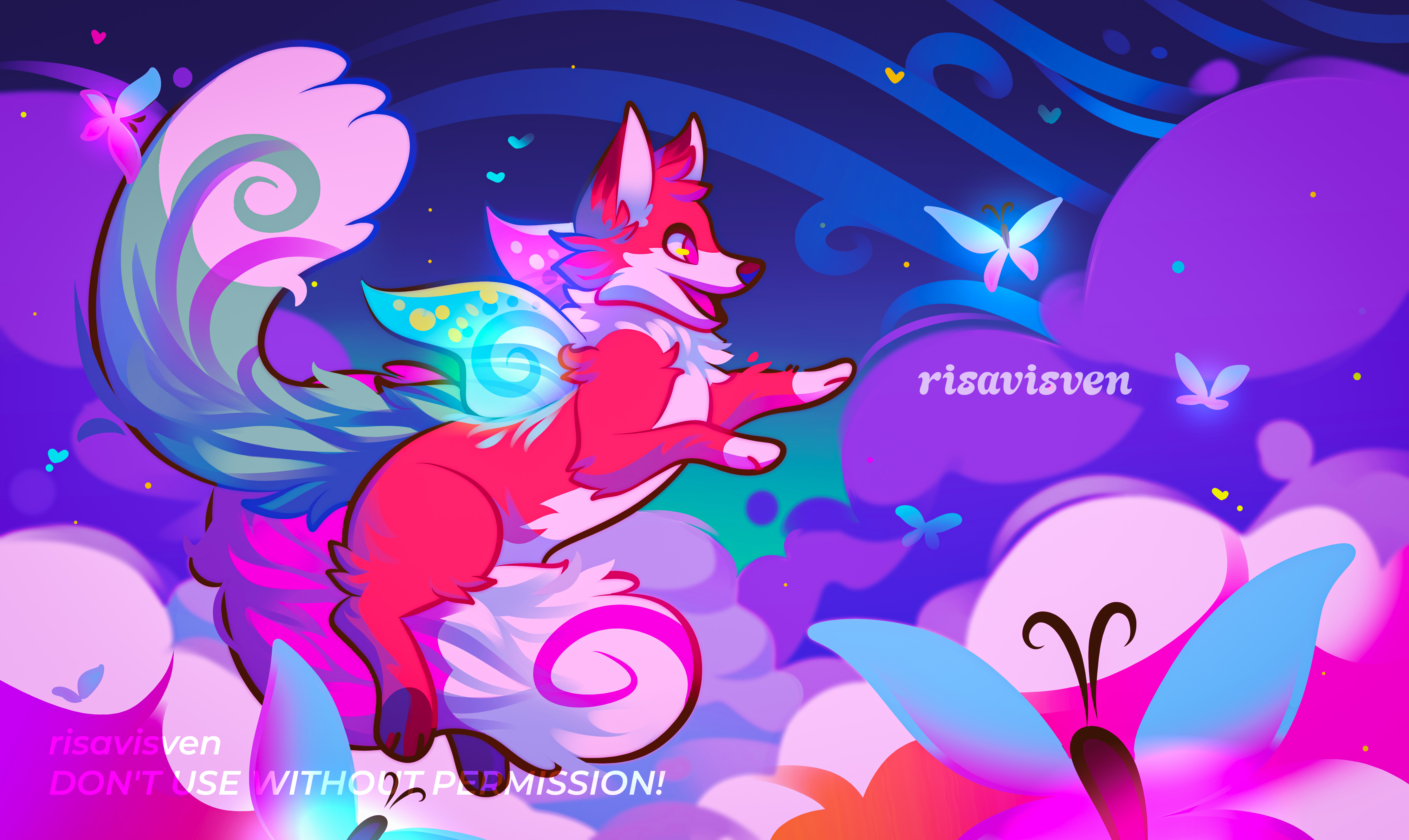 This is a piece I did for a DTiYS challenge on IG (for xionghea). The fairy fox is gleefully chasing semi transparent butterflies around, they could be friends! Who knows really.