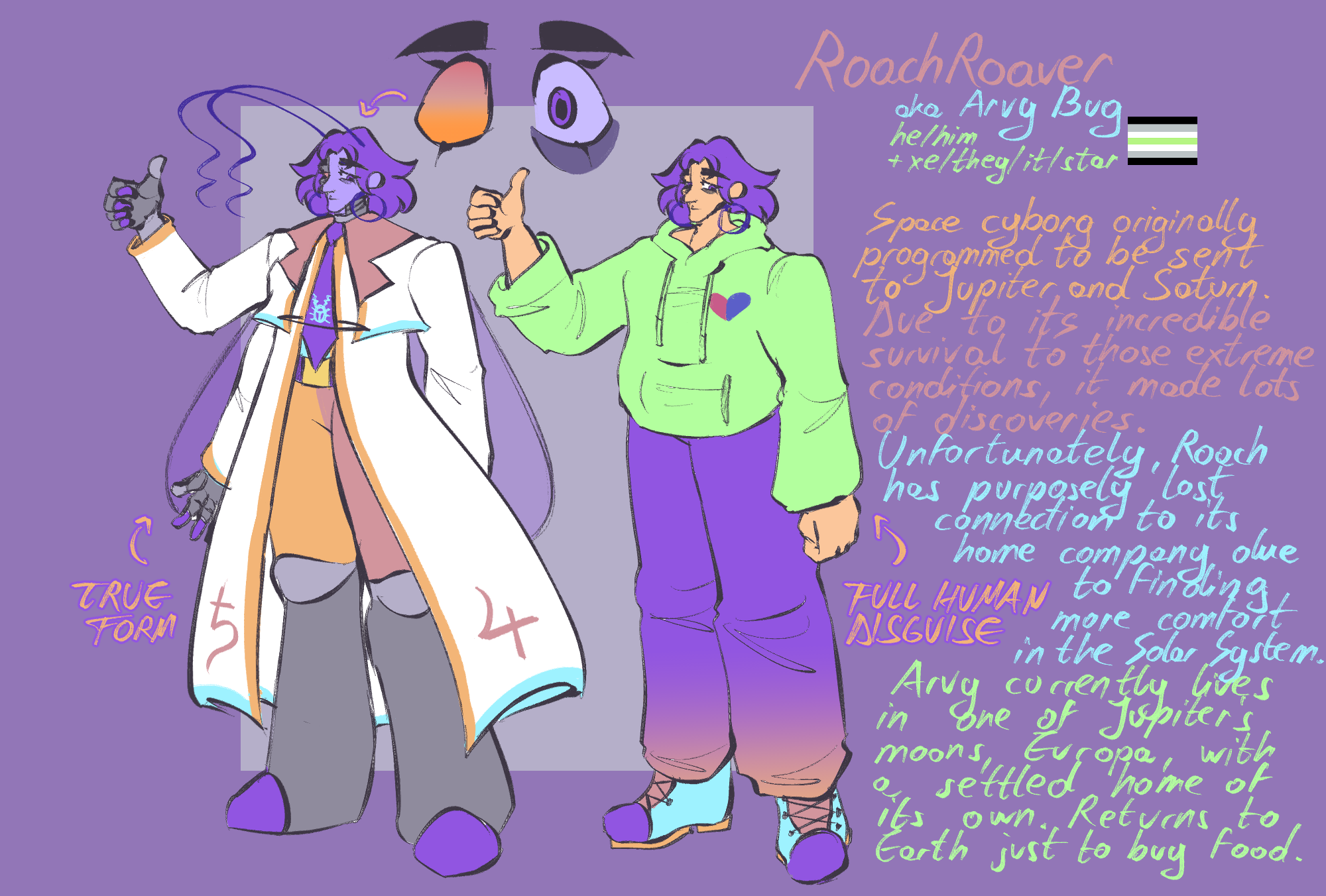 i know some **** here has no logic but i just made this stuff for fun and i think this new Arvy looks so coolIn the distant future, when technology got advanced, long after our timeline, RoachRoaver is a space cyborg in which its earlier life wasn't much known besides that it ended up working as a space probe/rover that could survive extreme conditions even as a half-human. It even has its own small spaceship that could travel around the Solar System in extreme speeds and potentially land on some planets and moons, but sometimes all it needs was just its own personal approach to land or explore a planet, like when he originally got sent just to explore our System's colossal planets, Jupiter and Saturn. He can even land on other planets but he needs special equipment. After a long time of exploring the System, Arvy didn't seem to be in the mood to even return to his own home planet given how calming he claimed the outer space was, and how tired he was that all he got asked for when he'd return on Earth is just about his discoveries rather than anything else and was irked of being treated as a celebrity all the time. He decided to purposely lose connection to his home company before settling his new home in one of Jupiter's moons, Europa. When he's alerted by upcoming space probes potentially spotting him, Arvy would take drastic measures by moving his home all the time before things settle down and move back to his home moon. Luckily for Arvy, he was also programmed to be able to disguise as a fully human, so whenever he needed to get to Earth without being treated like a celebrity, he could use the disguise to look like an average human. Fun facts: - Arvy's antennae serve as radio-like antennae and they're strong enough that he can even get internet, radio, music or television connection from Earth. - His voice sounds bitcrushed because his voicebox hasn't been upgraded in a while. - He can't exactly survive forever in the said planets (except Earth) which is why he's currently settled in a moon with gentler conditions. i know some shit here has no logic but i just made this stuff for fun and i think this new Arvy looks so cool0 Comments 0 Shares 4 ViewsPlease log in to like, share and comment!