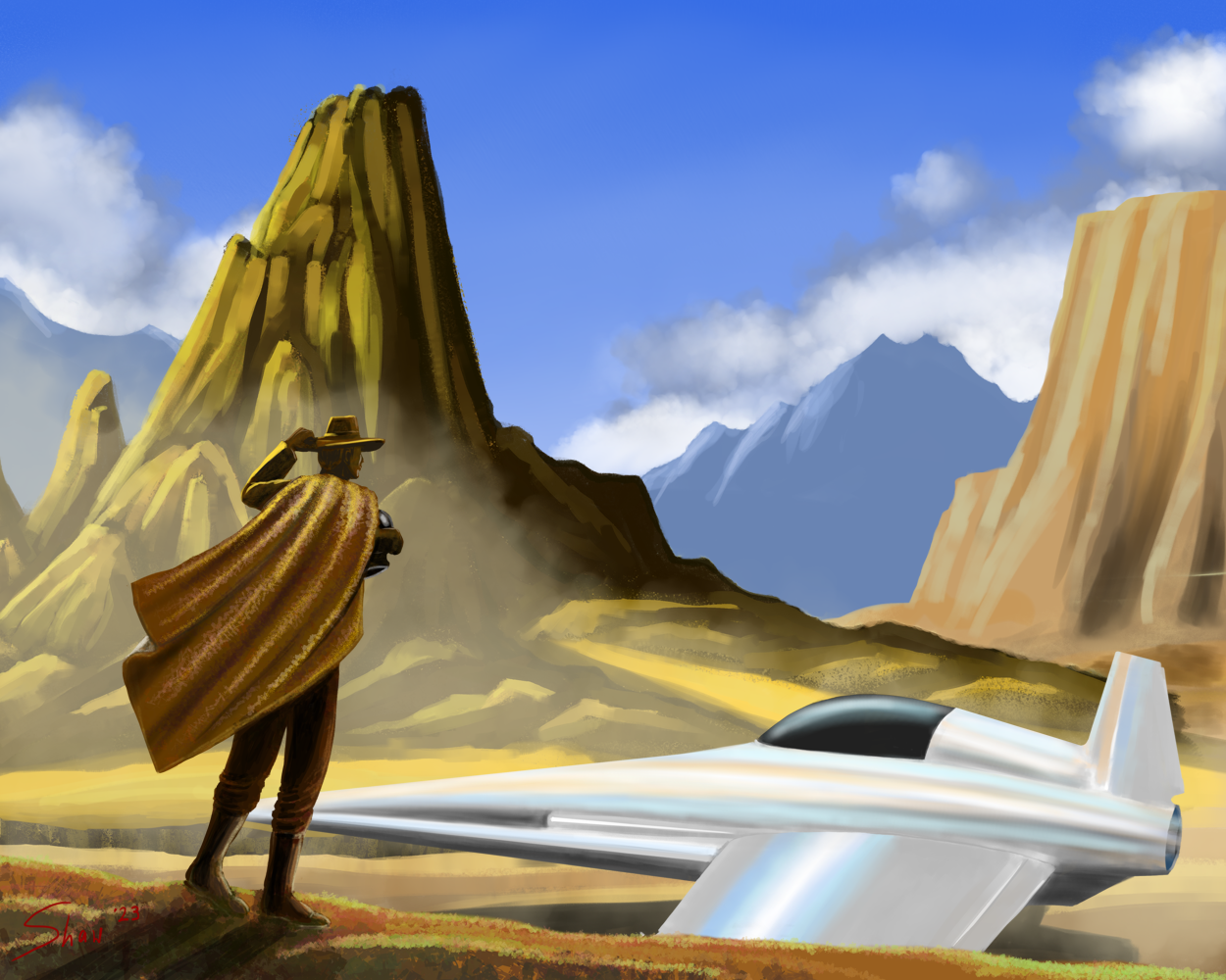 Painted in Krita.A drifter crosses a rocky landscape to return to his faithful mount - a starfighter. Time to swap the hat for a helmet. Painted in Krita.0 Comments 0 Shares 26 Views -