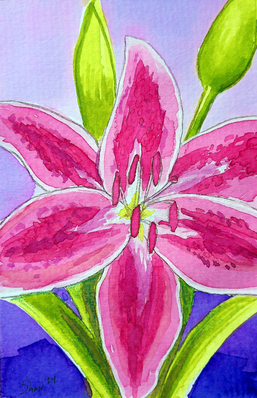 I've never used liquid watercolor before (only tube and dry), but got three bottles of it the most recent edition of Sketchbox. I really love trying supplies and media I've never tried before. In this case I had magenta, purple, and leaf green, plus a green pencil and a brown one, so I decided to try and paint something with just those items. Other than a touch of white gel pen at the end, I managed it. Stargazer Lilies are among my favorite flower, the smell is so sweet, so I decided to try and paint them. I loved the intensity and smoothness of the paints but obviously need to learn subtlety, ha ha. It was fun though!I've never used liquid watercolor before (only tube and dry), but got three bottles of it the most recent edition of Sketchbox. I really love trying supplies and media I've never tried before. In this case I had magenta, purple, and leaf green, plus a green pencil and a brown one, so I decided to try and paint something with just those items. Other than a touch of white gel pen at the end, I managed it. Stargazer Lilies are among my favorite flower, the smell is so sweet, so I decided to try and paint them. I loved the intensity and smoothness of the paints but obviously need to learn subtlety, ha ha. It was fun though!0 Comments 0 Shares 31 Views