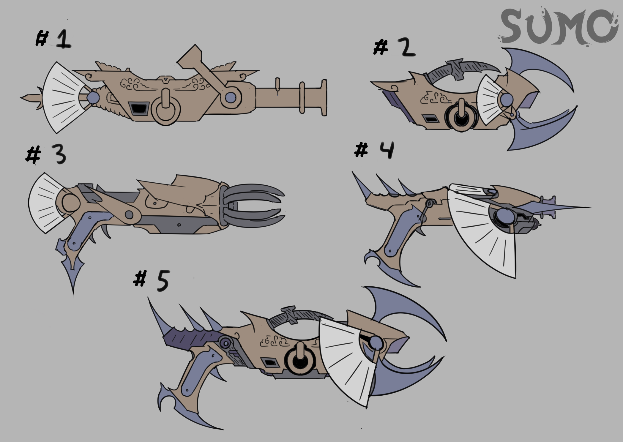 Concept art for my game SUMO of different iteration designs of the Cyclone, a weapon that shoots... cyclones.
