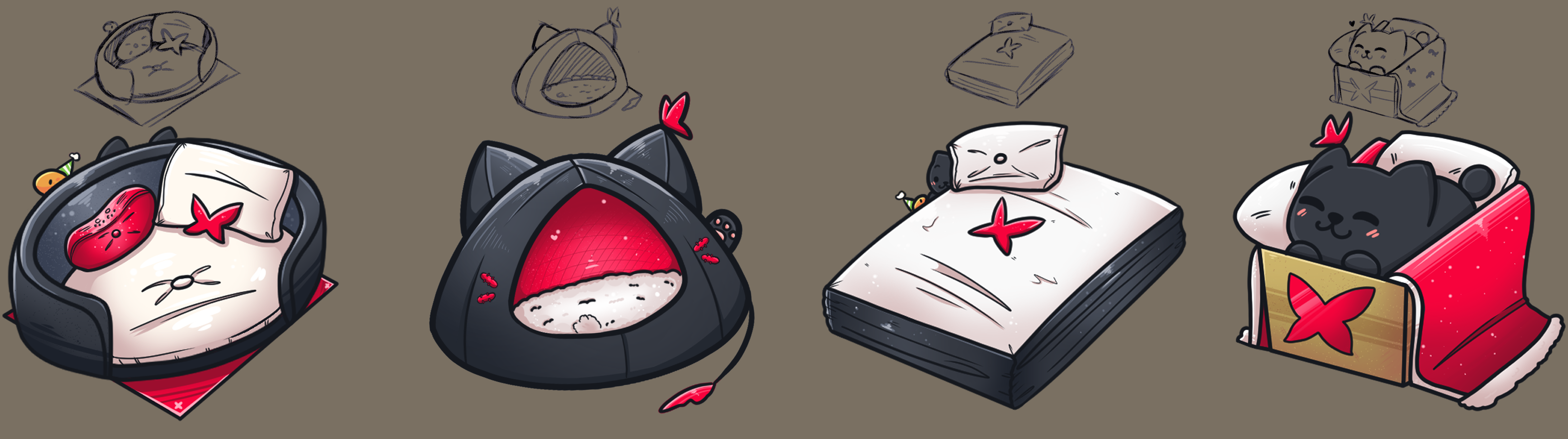 The sketch and final renders for the patreon badges! This one went through a couple of variants before it settled on cat beds, there was the idea of using a caterpillar to butterfly but something was too charming abotu the cat bed idea it wound up taking center stage. Originally it was going to be the simplest bed first (far right) then to the very fancy plush bed (far left), but it felt more accurate to go the other way which resulted in the final line up being how it is.