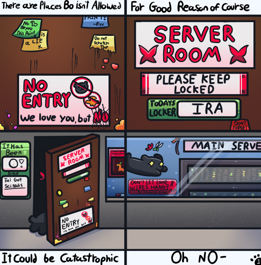 Overall this was a super charming comic to make and I hope it got people curious to the event going on..hey, speaking of the event, I cant fidn my hat and jacket anywhere where'd that go??The silly teaser for this years Get Weird event, surprisingly I only had one straight idea for this which was Bo sneaking into the server room causing the event, there were many fun ideas tossed around for what to add to the door and area. Some of the sticky notes are references to other media, and some are from staff themselves which I used specific colors to coordinate who made what, Ira was the one to suggest it was their job to lock the door that day which led to Bo getting in! Overall this was a super charming comic to make and I hope it got people curious to the event going on..hey, speaking of the event, I cant fidn my hat and jacket anywhere where'd that go??0 Comments 0 Shares 9 Views -