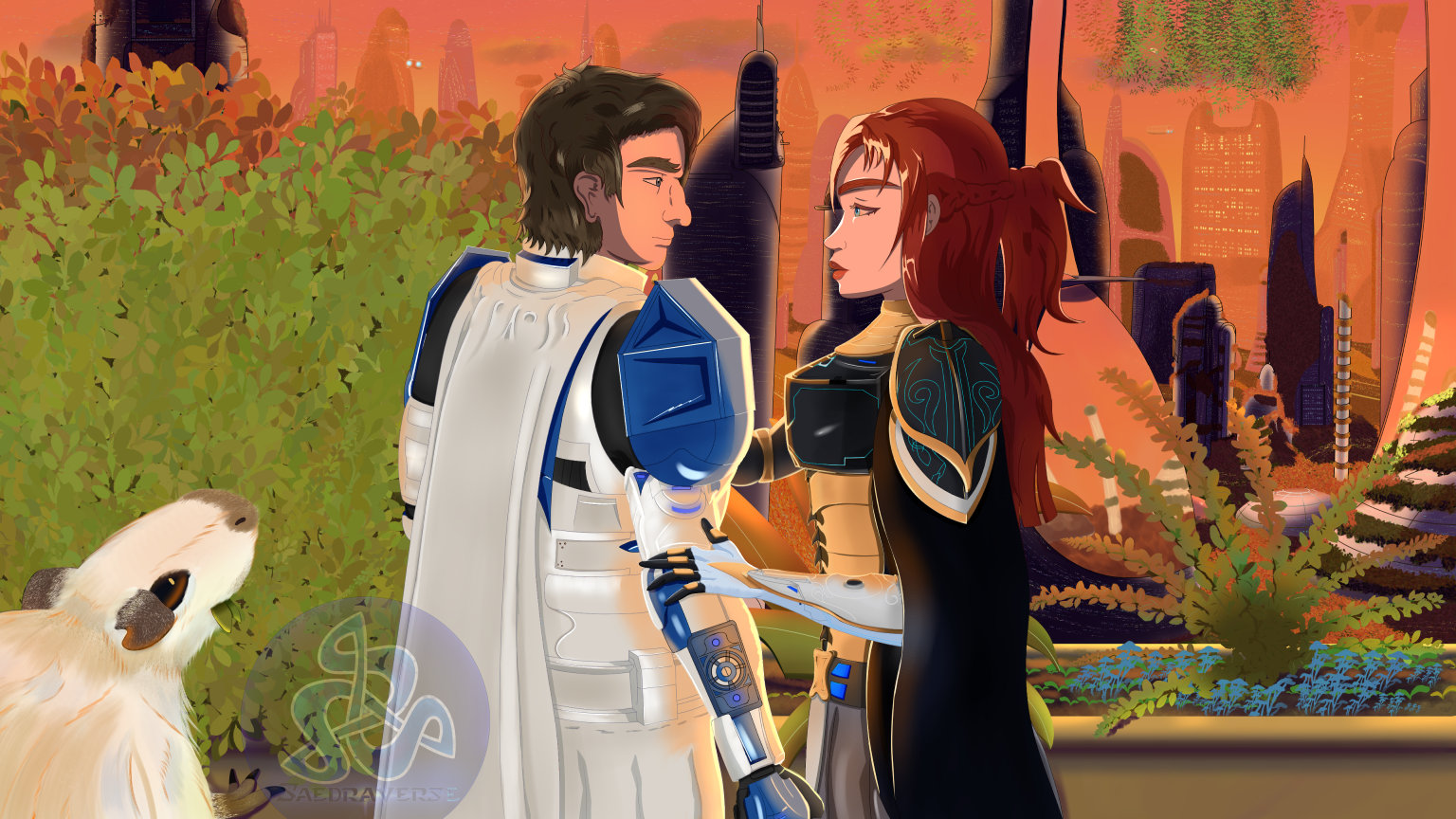 Lore: The scene depicts the two first born Saedra, Ewan & Ishtar on the planet of Koganeno, it's vast near planet covering city in the background. A domesticated Capybara of the Silkie Breed off to the side.