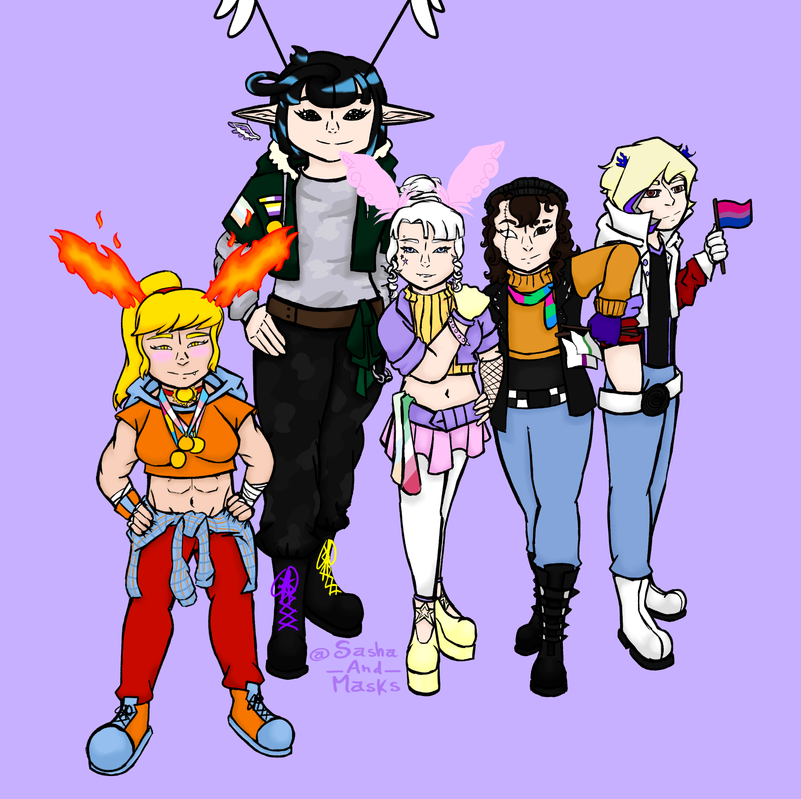 From tallest to smallest: Al (they/ae/void/fog), Katashi (he/him), Yuchi (she/her), Aïshi (any pronouns), Labyrinthe (she/her)