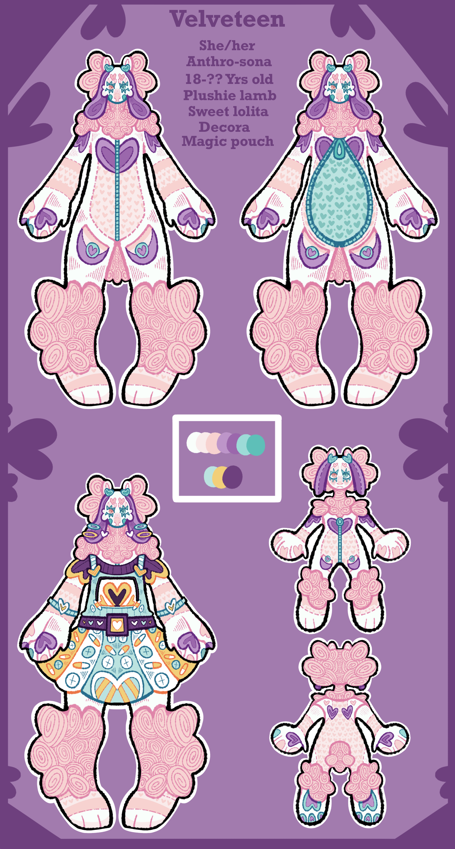 +Velveteen is a plush anthro-sheep that enjoys fashion, sewing, self-care, candy, and rainy days! She's made out of soft material that can mimic wool. She's one of the few plush people within the world of Pyscheterra. She is unable to have biological children because of the nature of her race as a plush anthro. Velveteen is currently working as a florist and part-time dollmaker from her home.+