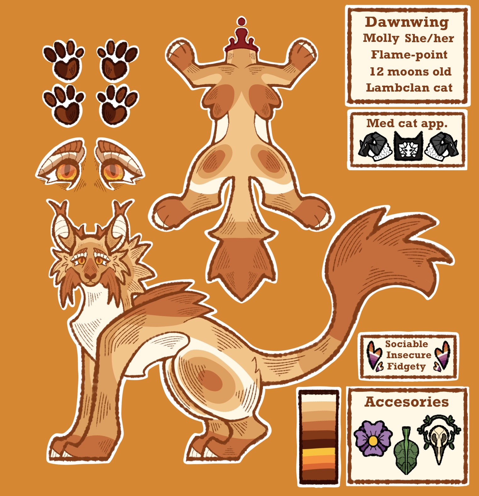 +Not much to her! She's a young scraggly medicine cat apprentice. Even if she has her full name, she considers herself to be "unworthy" of her title as a medicine cat. She is Lambclan's only current medicine cat, with the previous one succumbing to omen-like seizures. She's a bit of a loner, usually straying away from the other apprentices of Lambclan. She does, however, take her job incredibly seriously, toiling away at the medicine den from dawn to dusk.+