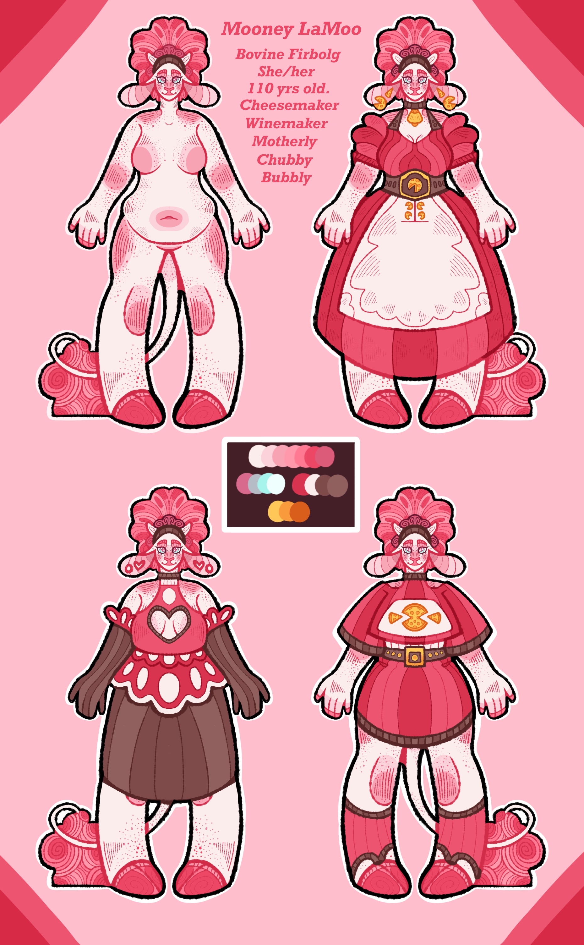 +She's chubby in build and 7'10 in height.+Mooney is a firbolg (bovine-type) +Mooney is based in D&D 5E. ++++ +Mooney was born to a nomadic tribe of fey-touched firbolgs, however, she had always felt out of place within her group's society. The constant moving, lack of communication with other races, and general dislike for competitiveness left a young Mooney feeling incredibly frustrated. Growing up, she didn't have many friends because of the tribe's constant isolation, and she didn't fare well with other firbolg children. There was, however, one benefit to the continuous moving; the experience of finding and tasting many different foods. At first, it was just different roots, berries, and meats, which in their own right intrigued Mooney, but she wasn't satisfied. Once she was old enough to sneak out, she'd make her way to nearby civilization, and that's where she discovered her love for cheese. As she got older, she continued to sneak out more and more, until finally, she just left. Mooney has since then apprenticed, adventured, and experienced all that life has to offer.+ +Mooney is by no means shy, quite the opposite actually, she's an incredibly bubbly and outgoing firbolg! Her charismatic traits make her an excellent businesswoman, which allowed her to open her own cheesery and small-side winery. She has a tendency to act incredibly motherly towards those younger than her, as well as those that she perceives to be lost or childlike. She can become incredibly protective over her friends, herself, and her business. Other than that, she tends to be incredibly relaxed. During her adventuring days, Mooney was a renowned Cleric who practiced in the Domain of Spice. Her talented spellcasting now serves her in her cheese and winemaking. She's been known to infuse her food with small bursts of vitality cantrips; making it a perfect stop for adventurers.+ +A little-known fact about her is her love for perfumes and scents! A guilty pleasure for her, she has over 40 different perfumes picked up from her various commissions and adventures. Her favorites among them are Vanilla-bean, Raspberry-Juice, and Chocolate-Syrup. Mooney is also a lover of wine, charcuterie boards, and of course, cheese! She's a huge fan of camembert, gouda, brie, and goat cheese! Her preferred wines are plum wine, raspberry champagne, and a hearty white. + ++++ +Mooney is 110 years in age (30ish for firbolgs) +She goes by she/her (Cis-Woman) +Mooney is Aroace (However she enjoys the occasional promiscuous outfit! She's a lady of many fashions) +She's chubby in build and 7'10 in height.0 Comments 0 Shares 28 Views -