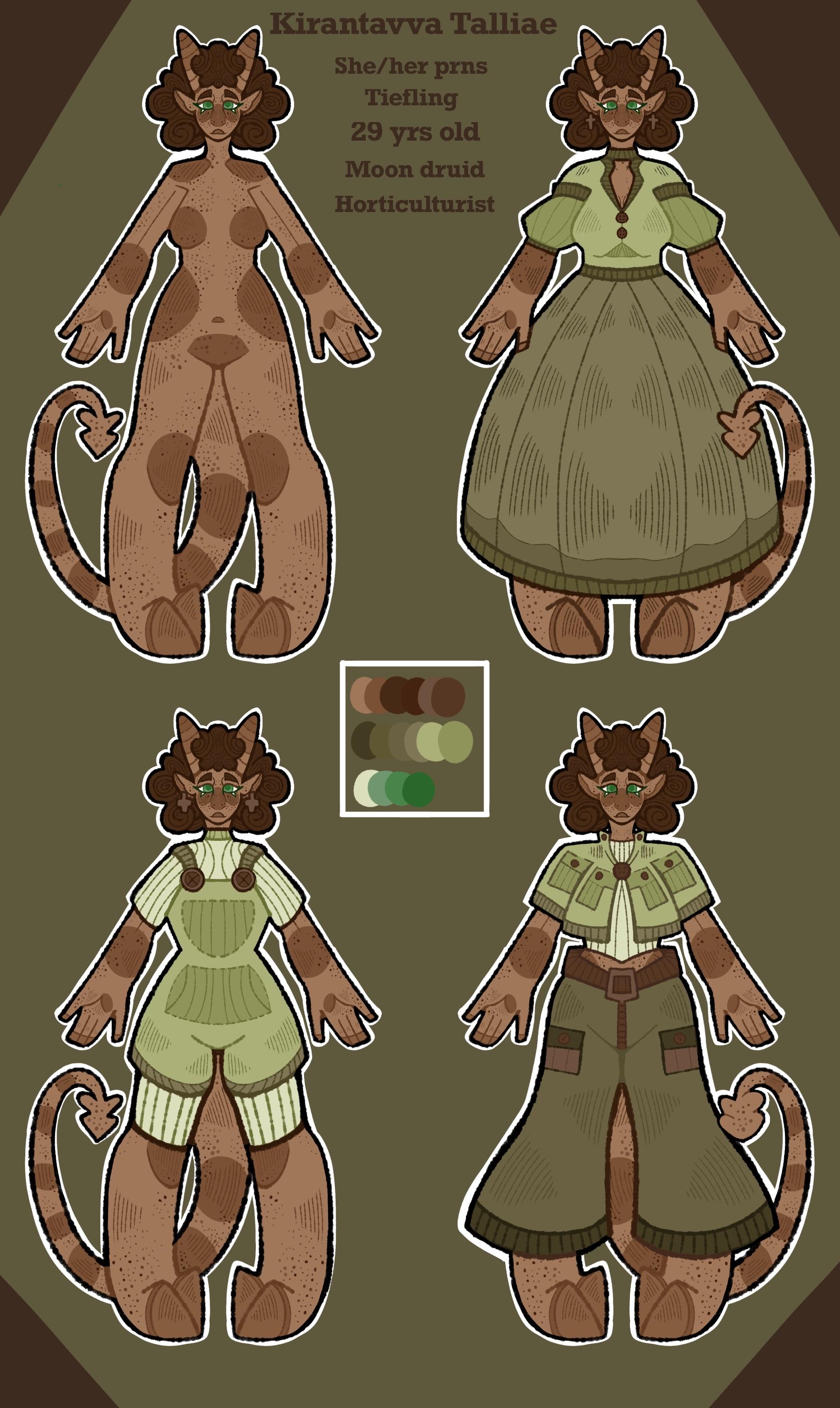 -Kirantavva is based in DND 5E!- -She is a tiefling druid who specializes in wildshape! (usually into a Direwolf)- +++ +Kirantavva is a cynical druid tiefling with a knack for getting into trouble! She enjoys the occasional pickpocketing for some shinies and snacks from unfortunate townies! She has a trouble with ale and sometimes gets too carried away with a good spirit or scotch! Do you want her to join your party? Offer her a new pet and a couple of barrels of beer, and you'll have yourself a new member+ +Her past is riddled with guilt and shame. Born into a cult and indoctrinated at a young age; Kiran was the result of infidelity by her mother. She was used as a scapegoat by the cult leaders, and called a "devil-incarnate" for her tiefling features in an all-elven/human "community." She was lucky enough to meet an elder deer-goddess named Haveskrava as a young child, which had taken pity on her. Together with her new mentor; she learned the way of druidism and wild magick. Once she turned 18, she managed an escape from the cult.+ +Kirantavva is engaged to her darling s/o Therese! Between them, they have 3 children. Kiran is a stay-at-home mom as most of her horticulture work is done in the greenhouse and garden located in her cottage's backyard. Despite Valentina and Liesel trying to pluck all her plants, she loves them both dearly. She found Valentina as an infant in a ransacked village with little to no survivors and has raised her as her own since then. Liesel is her sweet half-orc stepchild that belongs to Therese. She's currently expecting her third kid; Eider; who was immaculately conceived with the powerful magic of Haveskrava(The mother-beast.) Both she and Therese are incredibly excited to be welcoming a new kid into the world!+ +Due to Kiran's troubled childhood and adolescence, she had a very lacking education. She's mostly illiterate and struggles very much with reading and writing. She relies heavily on her fiancé and her own determination to learn the common language. Slowly, she's making progress at reading! Although she still struggles with writing.+ +She's allergic to apples but refuses to stop eating them, despite hating their taste. No one really knows why she still tries to keep eating them, but it's probably her trying to will herself out of an allergic reaction.+ +++ -Kirantavva is 29 years of age. -Kiran goes by she/her pronouns. -Kirantavva is a gay-panic lesbian. -Kirantavva has an average build with a bit of pudge, she is 5'6. -Her S/O is Therese -Her children are Liesel, Eider, and Valentina.0 Comments 0 Shares 32 Views -