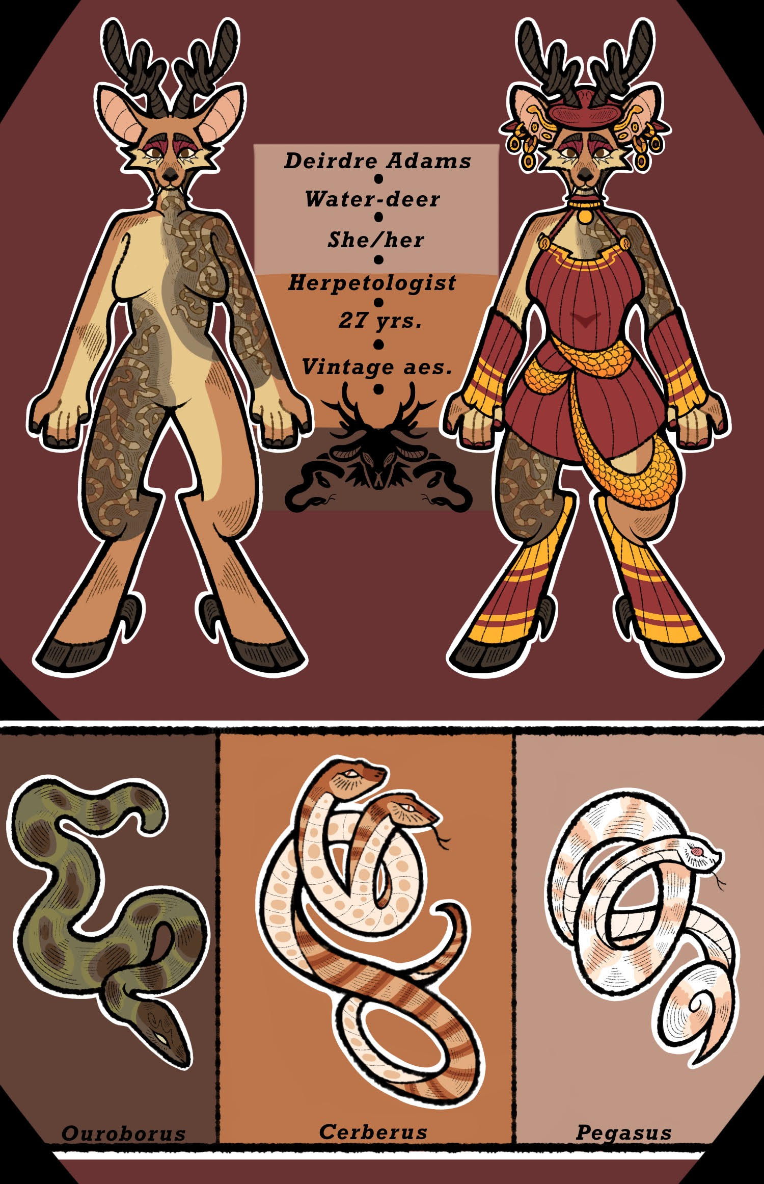 +Dierdre can sometimes come off as uppity around strangers because of her eccentric sense of self and sometimes her self-centered attitude. She's a sweet person at heart; she just finds it hard to connect with those who aren't her precious reptiles.++Deirdre is a Chinese water deer - red deer mix.+ +She is 27 years old; a Leo; and uses she/her pronouns.+ +Dierdre works as a herpetologist full-time, and a hobbyist snake breeder in her free time. Although she works with many different reptiles, Deirdre has an affinity for snakes in particular, having full sleeves of snakes tattooed on her body. She has 3 personal snakes as pets, as shown in the reference above.+ +She is also a fan of vintage and retro-vintage fashion, taking big inspiration from the 80s scandalous chic manner. She's also a collector of pipes, although she rarely smokes. Her favorite colors are reds, golds, and subdued shades of brown and black. She owns a various assortment of cocktail dresses and heels of varying lengths and styles.+ +Deirdre has 3 personal snakes that she keeps as pets, all snakes that needed too much care to be adopted or sold out. Her 3 snakes are:+ -Ouroborus: A runt boa constrictor with hereditary cataracts; rendering her virtually blind. She's the most recent snake in Deirdre's collection. She has a tendency to be quiet if not a little lazy and enjoys time outside of her enclosure during warm days. -Cerberus: Cerberus is Deirdre's rarest and most high-maintenance snake. They are a pair of conjoined corn snakes due to a reproductive anomaly. They're spunky, feisty, and prone to hissy fits. Despite their sour attitudes, Deirdre loves them bother dearly. -Pegasus: Pegasus is Dierdre's oldest and first snake! He's an albino hognose, the most nervous out of the bunch. He enjoys exploring his enclosure as well as Deirdre's apartment, however, he tends to be nervous around people. +Dierdre can sometimes come off as uppity around strangers because of her eccentric sense of self and sometimes her self-centered attitude. She's a sweet person at heart; she just finds it hard to connect with those who aren't her precious reptiles.+0 Comments 0 Shares 29 Views -