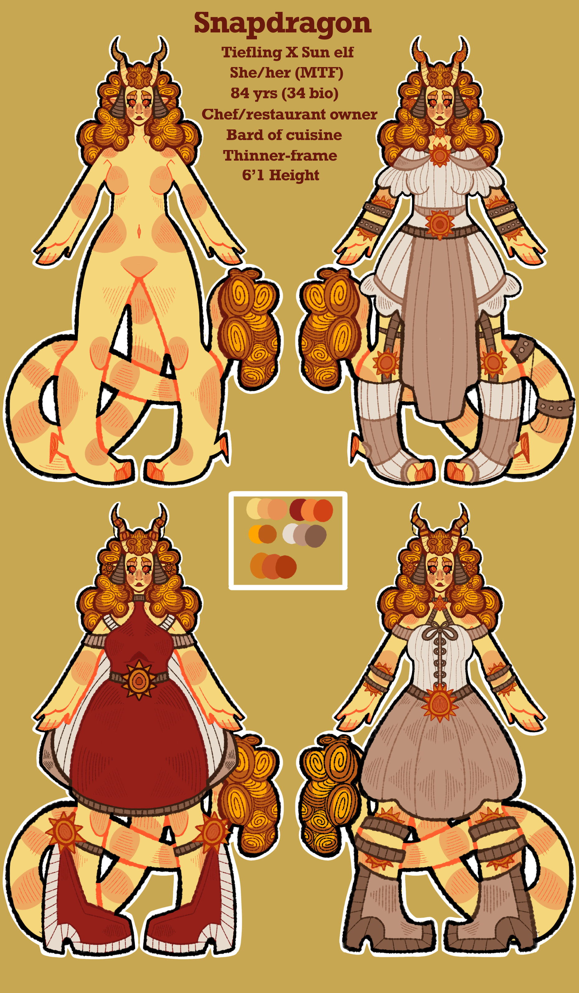 -Snapdragon is slender in build and stands at 6'1.-Snapdragon is based in D&D 5E! -Snapdragon is of the tiefling-elven race. ++++ +Snapdragon is a fun-loving and adventurous tiefling! With a heart of gold and a stomach of steel, Snapdragon is a lover of the culinary arts. She's a runner of her own restaurant; and is constantly on the lookout for new and exotic ingredients for her dishes! A lover of all; this sweet-hearted lass will never leave you feeling sad.+ +Snapdragon was raised by a group of nomadic Dragonborn since she was an infant. Her name was given to her as a youngling by the clan, for both her love of spices and a predisposition to biting. She adores her family and has dozens of Dragonborne siblings, cousins, and relatives.+ +By all means, Snapdragon is a stress baker. She's been known to mindlessly bake 4-5 trays of lemon bars, cupcakes, and brownies when something is gnawing at her. She'll usually gift these sweet treats to her friends once she snaps out of her baker craze.+ +She struggles with very severe dysphoria which sometimes impacts her ability to work and go out. Luckily for her, she has a fuckton of friends and family that'll lovingly kick her ass and support her.+ +She's recently gotten engaged to her longtime girlfriend Violeta! They're both hardworking women that rarely have time at home, however, when they both get back in the evening, their favorite activities are cuddling together, running hot baths, and talking. They may not have a lot of time together every day, but they make every minute count! Violeta moved into Snapdragons bungalow where they live together. Although she doesn't know, Violeta is already searching for a wedding ring for the right moment.+ ++++ -Snapdragon is 31yrs old. (technically 84) -Snapdragon uses she/her (Trans lady.) -Snapdragon is pansexual. -Snapdragon is slender in build and stands at 6'1.0 Comments 0 Shares 26 Views -